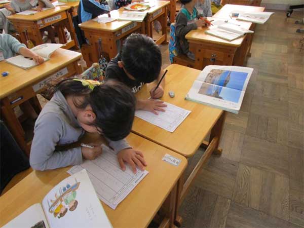 1年生では、ひらがなを覚えたので、ワークシートを使って学習をしています。教科書の写真や文から読み取ったことを丁寧に書いていきます。