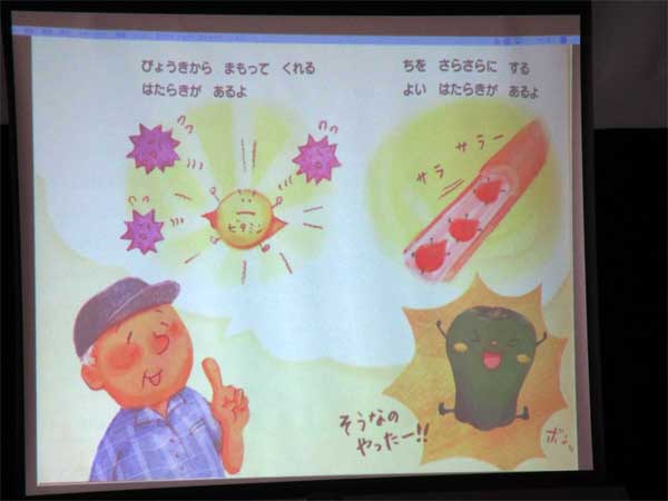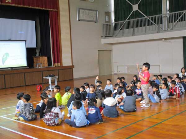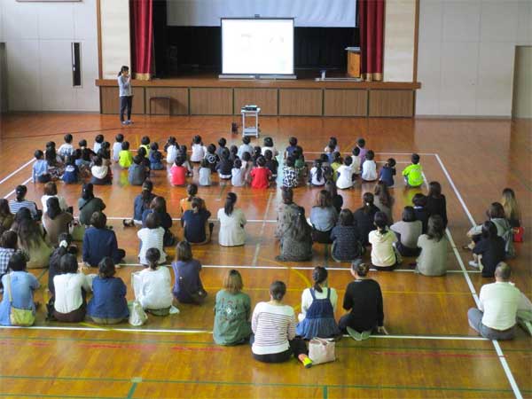 4限目は、1年生の子たちと保護者の方は、体育館で『すききらいなんてだいきらい』の絵本を拡大したものをみんなでみました。途中、どうしたら良いかなどの質問に対して、いっしょに考えました。子どもたちのアイディアや要望を保護者の方に聞いていただき、苦手なピーマンのごちそうが食卓に並び、栄養がとれるといいですね。