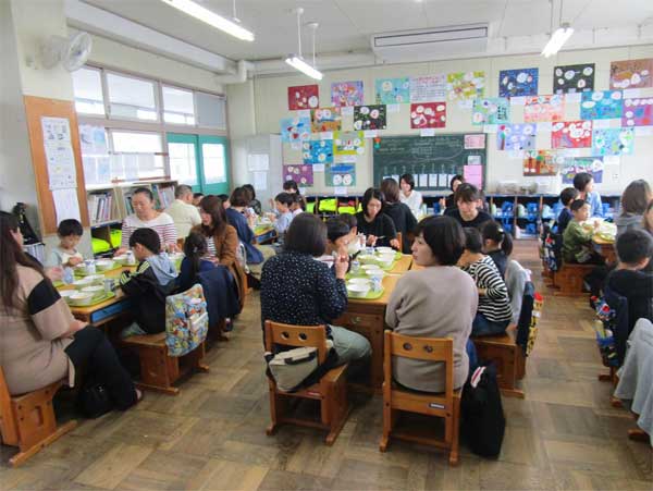 給食の時間は、保護者の方と一緒に給食を食べました。にこにこと笑顔でお話しながら、保護者の方に給食の雰囲気がお分かりいただけたと思います。