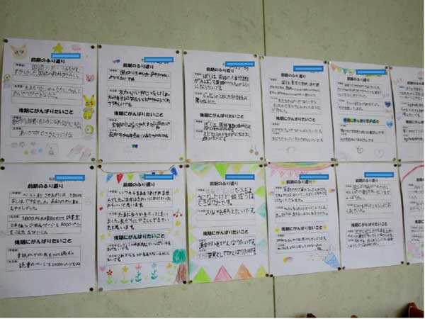 3年生は、教室後ろに掲示して見える化されていました。どの子も自分のことをよく分析していて、自分に合った目標が設定されています。とても感心しました。