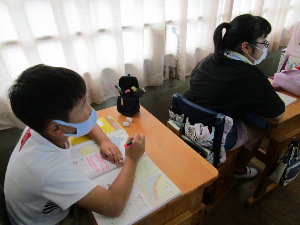 子どもたちは、暑い中ですが、マスク着用にもずいぶん慣れてきているようです。教室をのぞきに行きますと、上の学年になればなるほどしっかり落ち着いて課題に向かって取り組んでいます。
