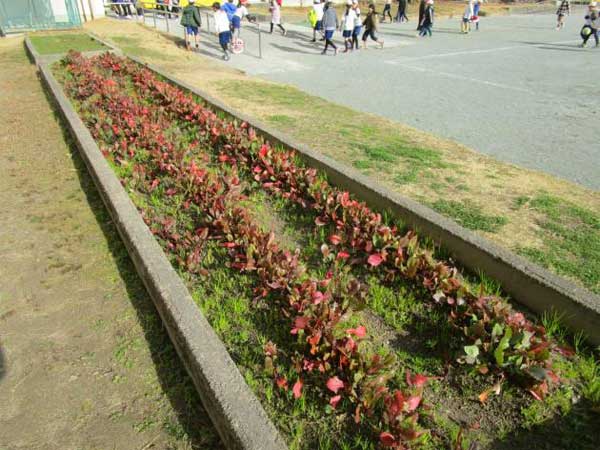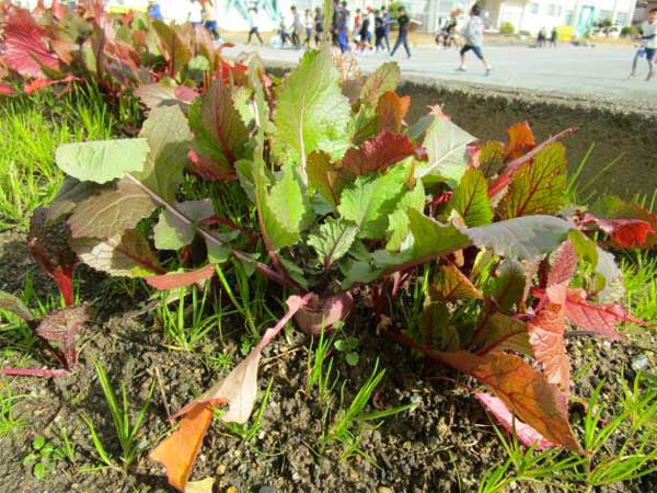 様子を見に行くと、3年生の子が「ホームページに載せるのに、とてもいいものがあるよ。」と手を引いて連れて行ってくれました。それは、学級園です。総合的な学習の時間に植えた赤菜が成長して食べごろになっていました。「特にここ見が地面から出ていました。収穫が楽しみです。