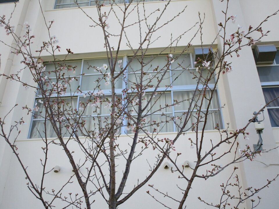 6年生の人たちが、卒業記念に植えてくれたソメイヨシノが、咲きました。みんなの登校を喜んでくれているようです。