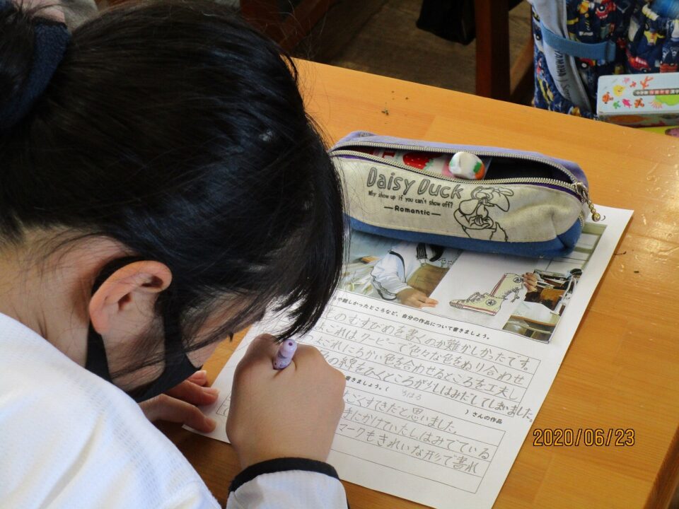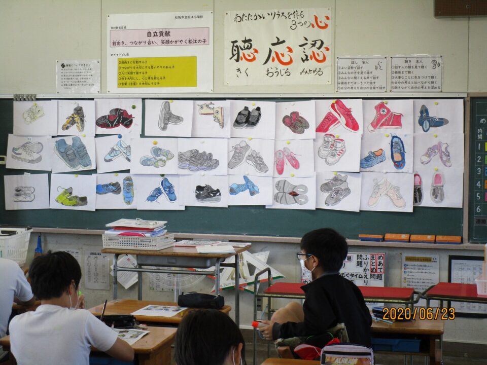 6年1組は、図画の鑑賞でした。みんな、自分の靴そっくりに細かい部分もしっかり描いていました。