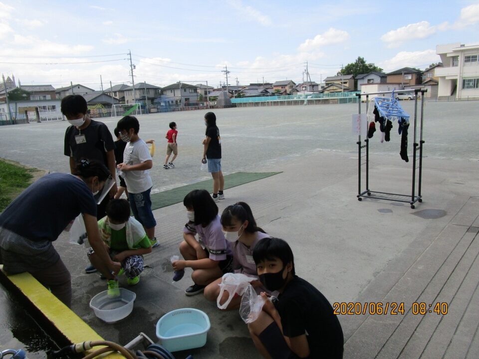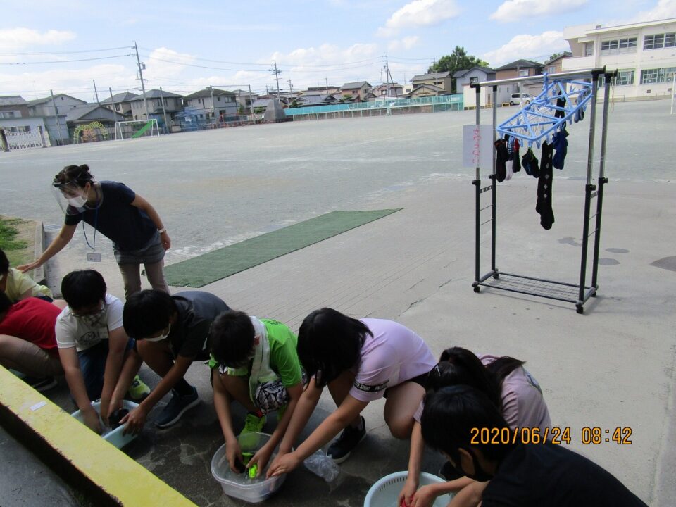 6年2組は、家庭科で洗濯でした。前日の靴下を持ってきて、手洗いをしています。水が黒く濁ってきたことで、汚れが落ちていることがわかり、きれいな靴下になりました。