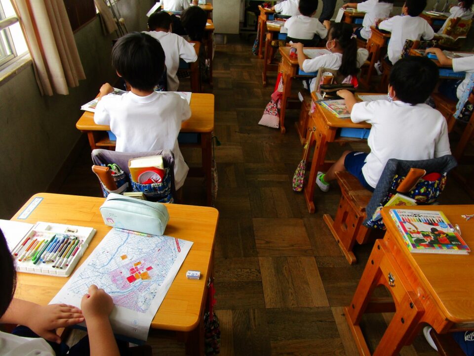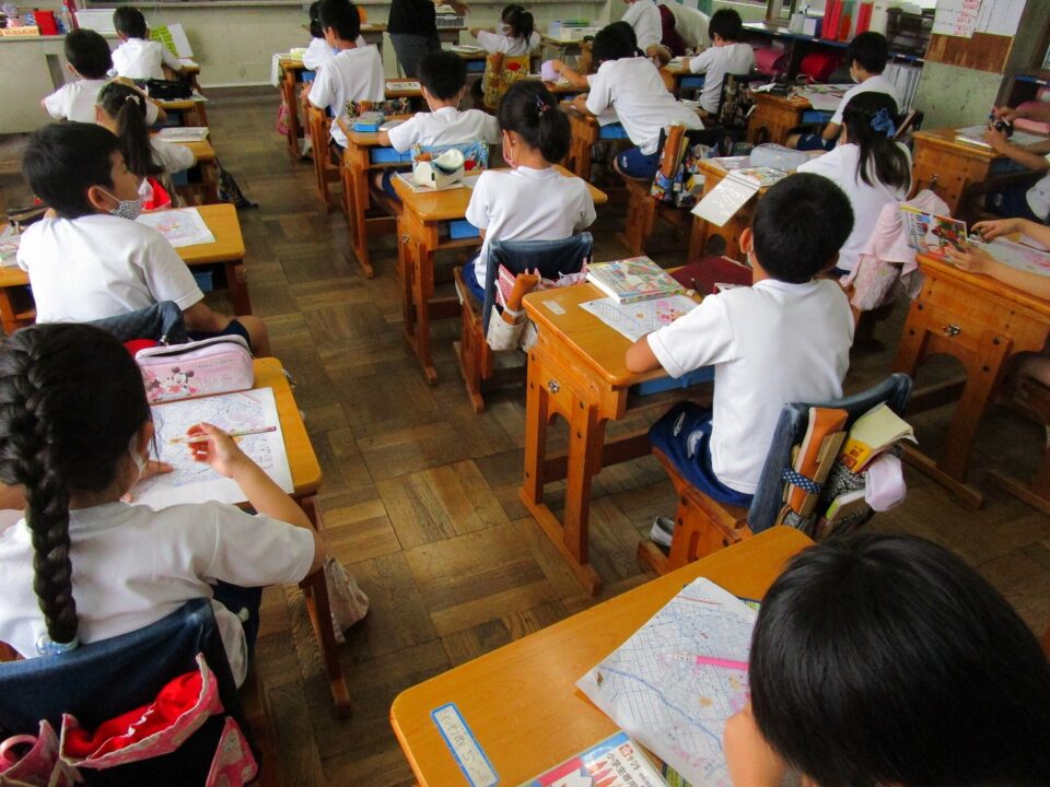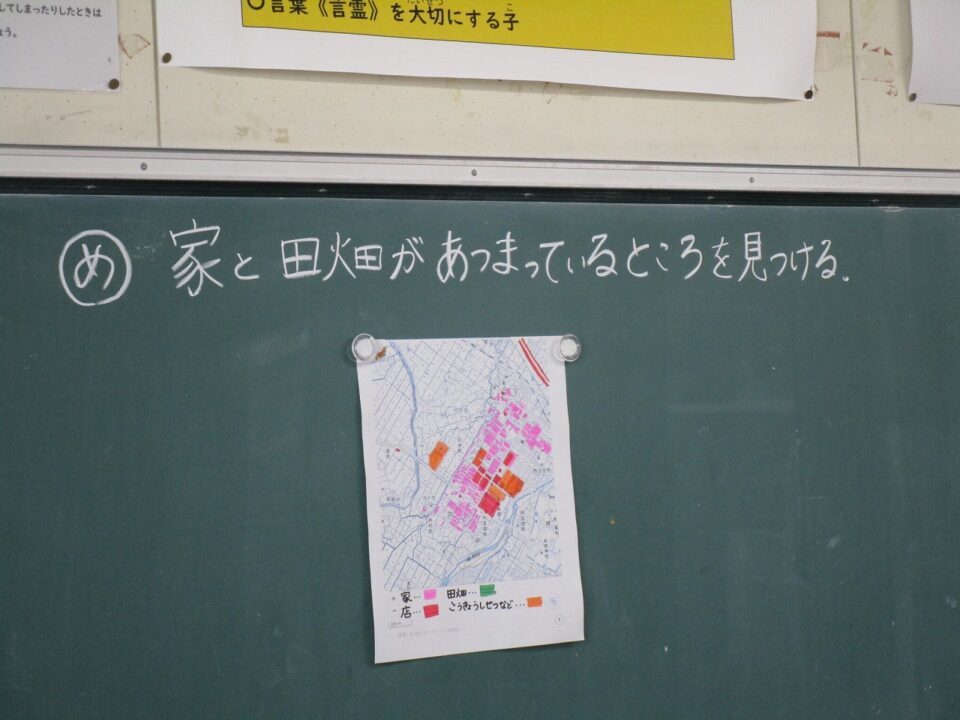 3年1組は、社会でめあては、家と田畑があつまっているところを見つける」でした。校区の様子を学習しています。
