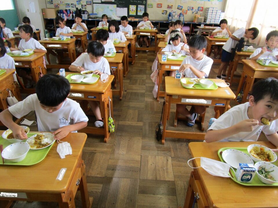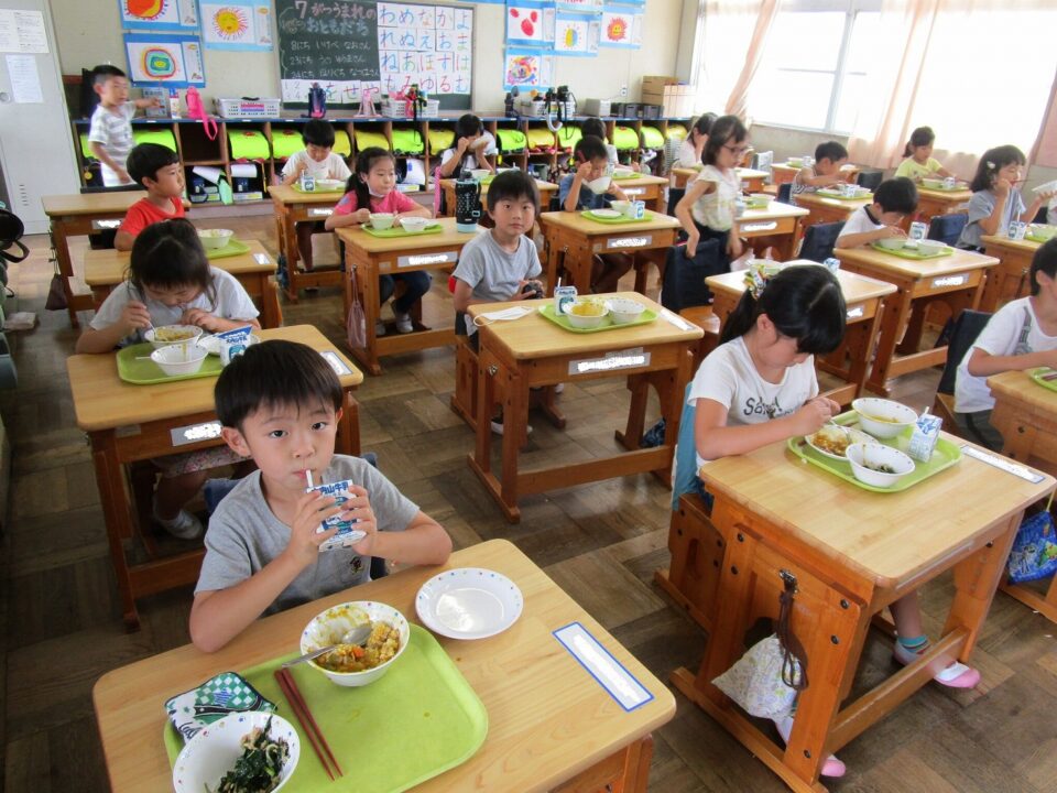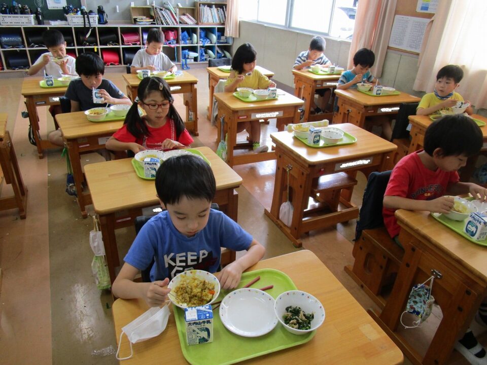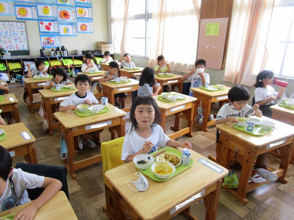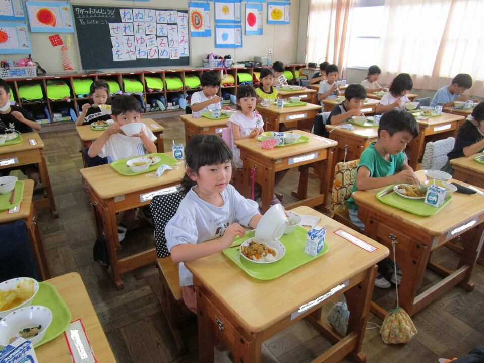 ①ご飯 ②まごころきらきらカレー ③牛乳 ④モロヘイヤのレモン和えのメニューでした。