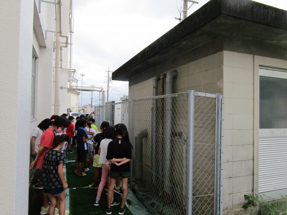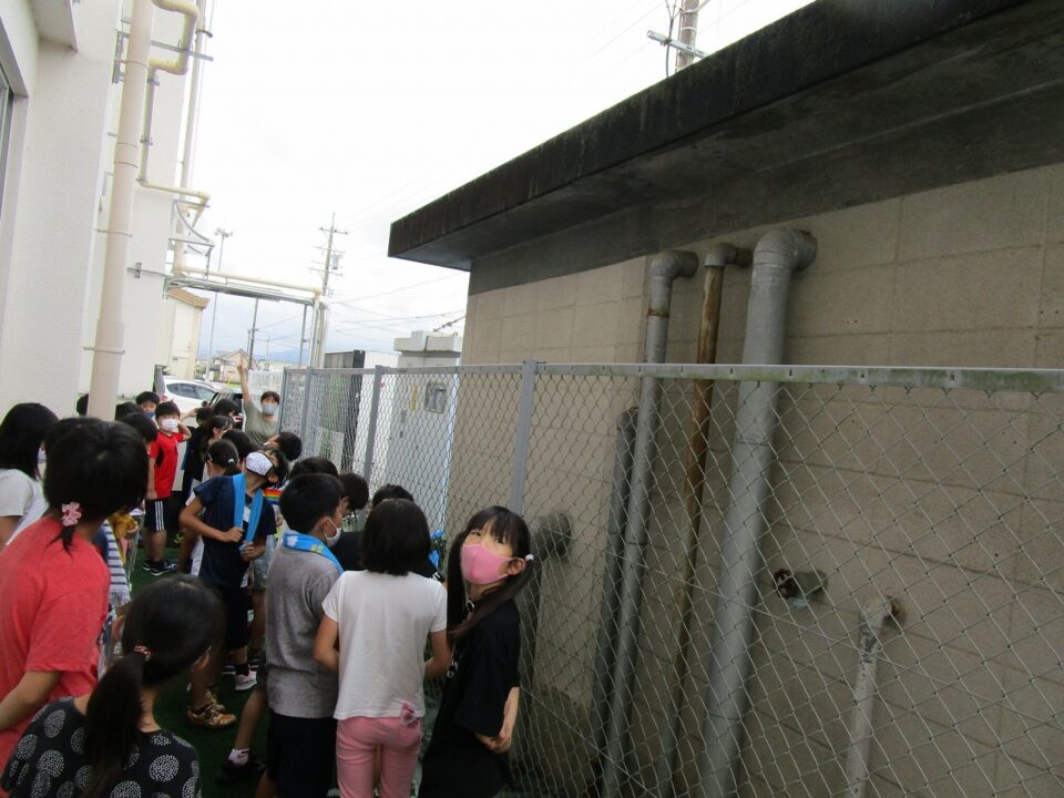 4-2は、社会科で水道の学習をしています。学校の水は、このポンプ室を経由して使うことができます。