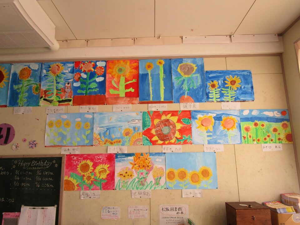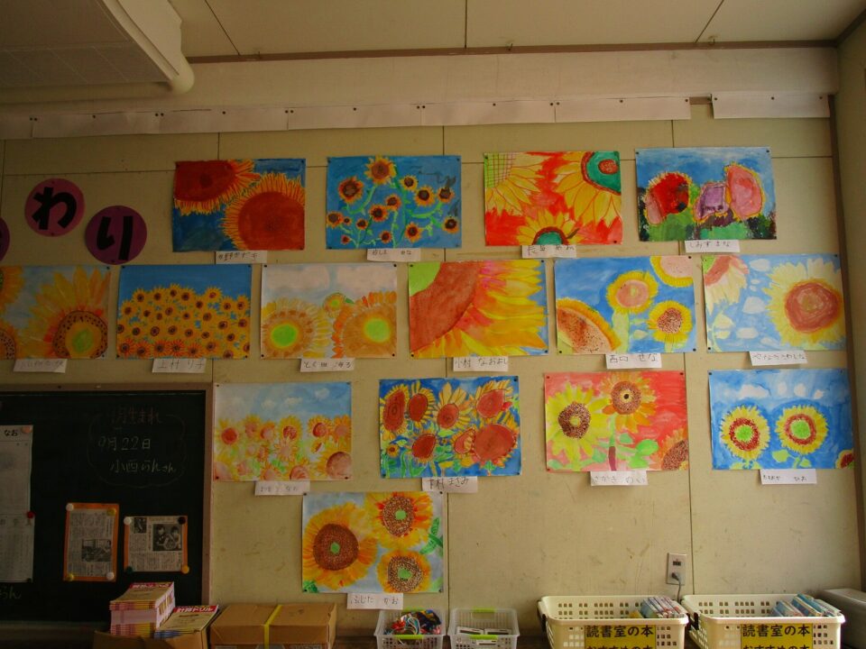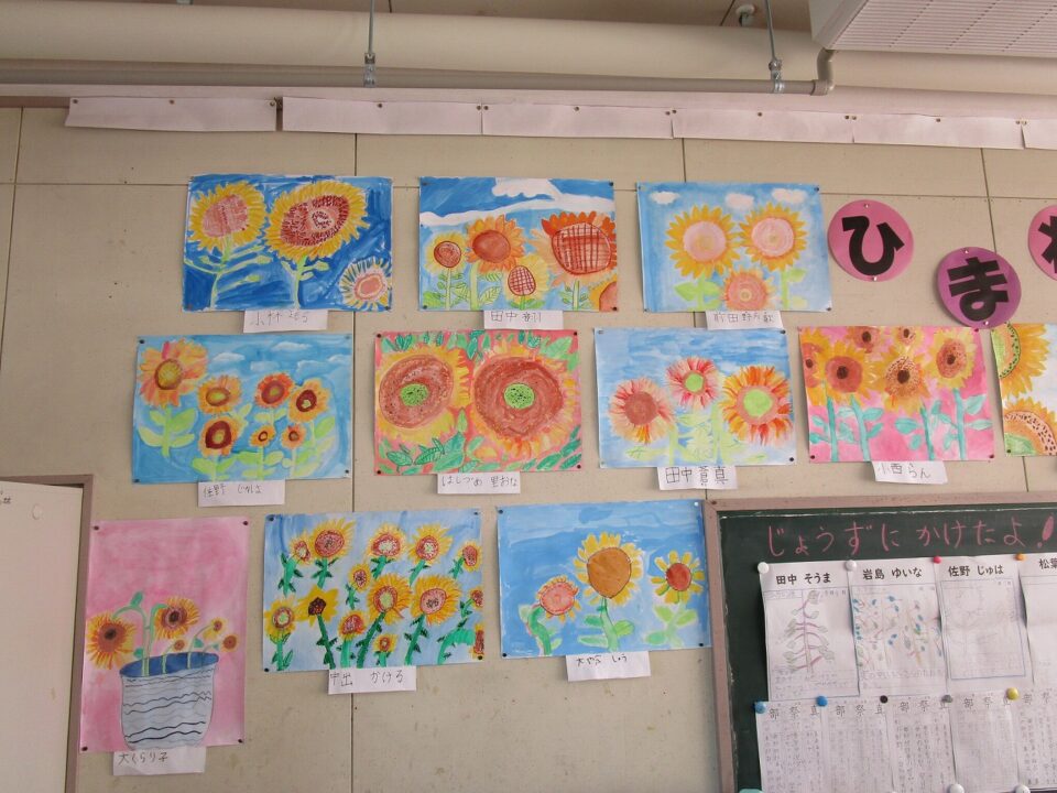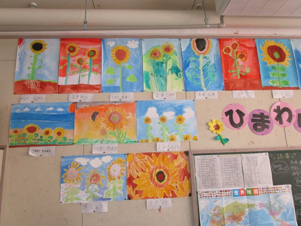3年生ねんせい教室きょうしつはいると、掲示物けいじぶつがひまわりの花満開はなまんかいになっていました。教室きょうしつがパッとあかるくなっています。