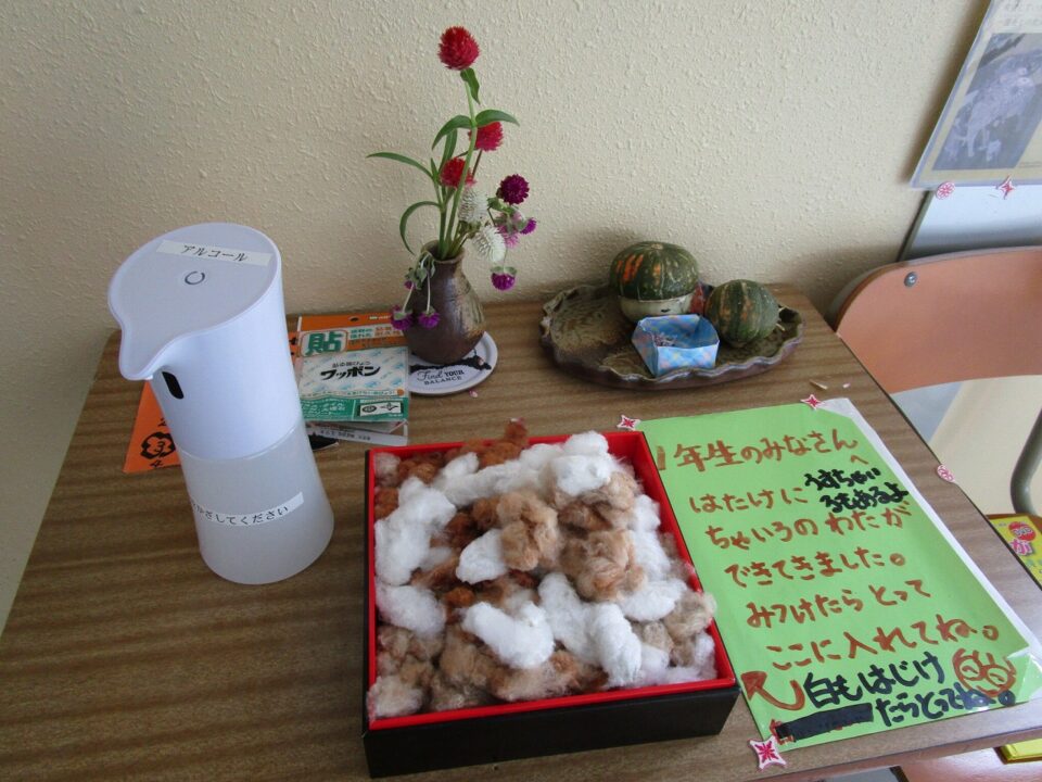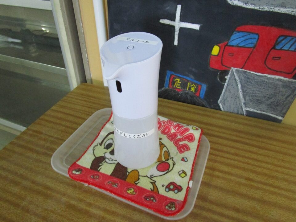 昇降口には、アルコールディスペンサーを置きました。近々、玄関にも購入して置く予定です。全国的に品薄でようやく手に入りました。