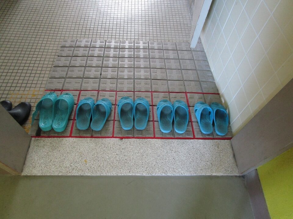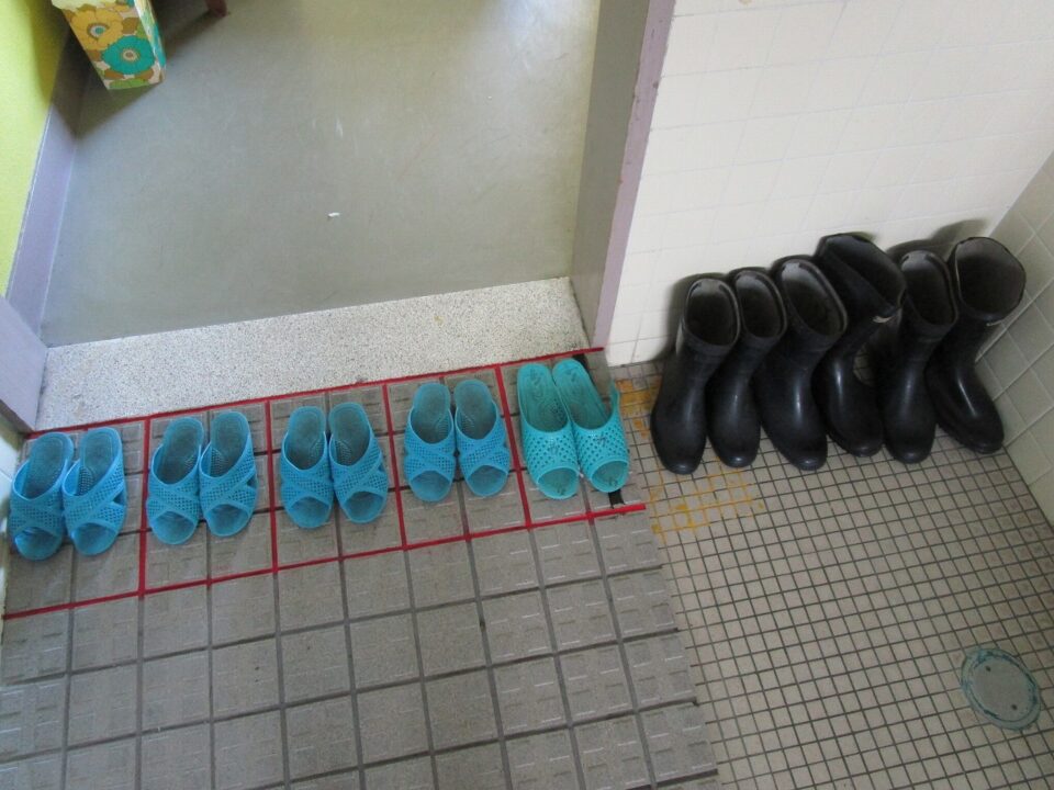 2年生男子トイレでは、スリッパを置く位置を校務員の三井さんがペンキで描きました。これで、この枠に入れるときれいにスリッパがそろえられます。