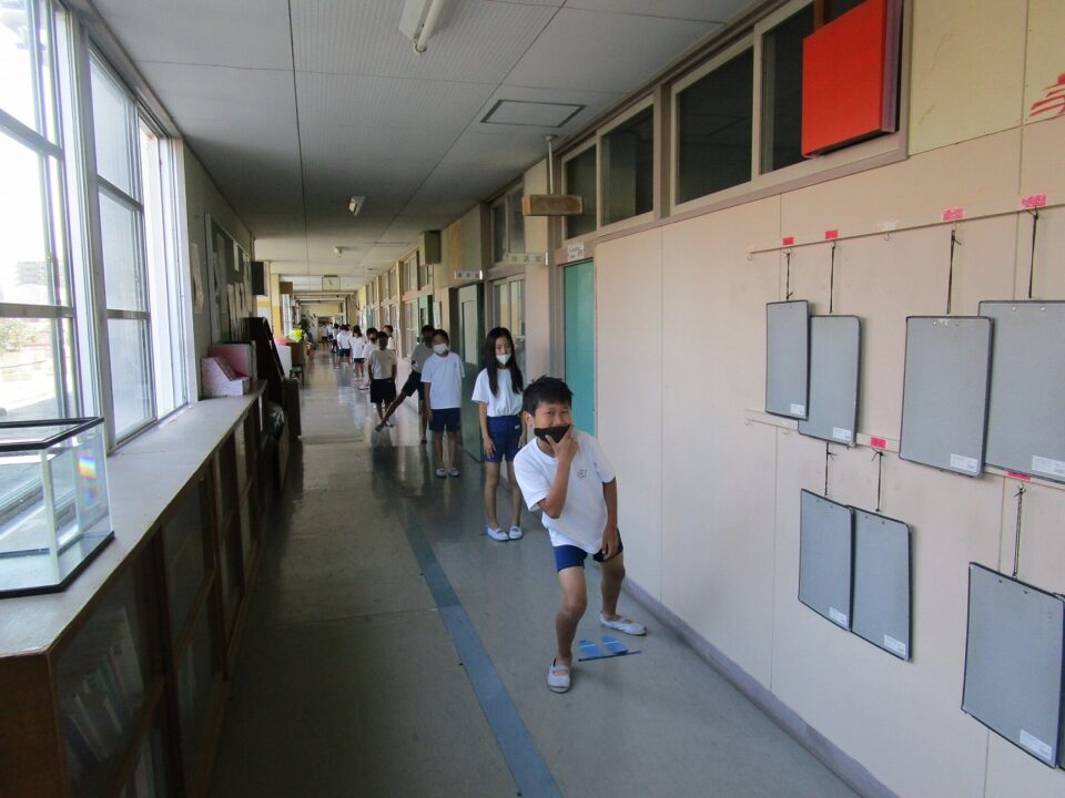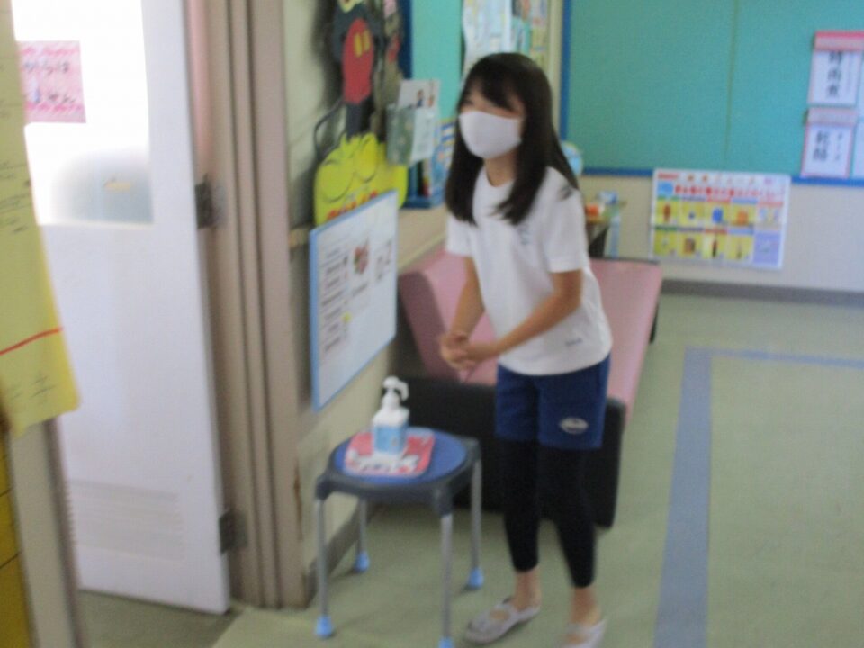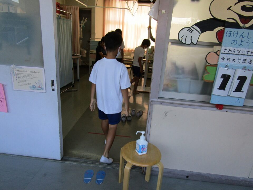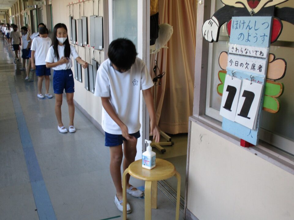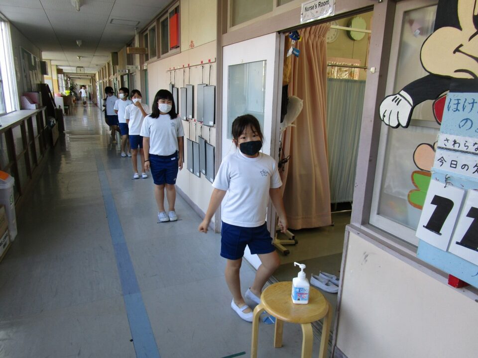 測定そくていわったは、一方通行いっぽうつうこうみち出口でぐちでアルコール消毒しょうどくおこなってから、教室きょうしつもどりました。