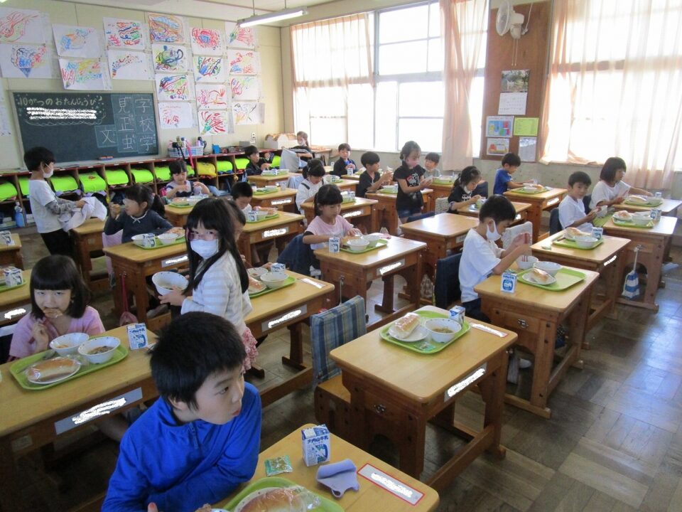 今日の給食の献立は、コッペパン、牛乳、ハニーガーリックチキン、コールスローサラダ、飯高産生きくらげのスープ、りんごジャムでした。