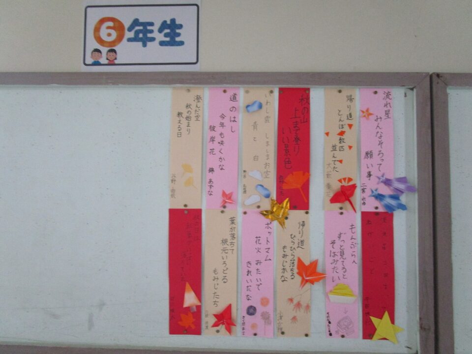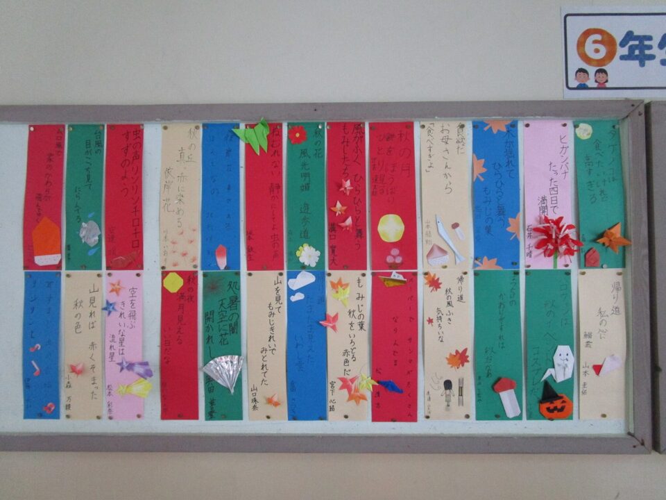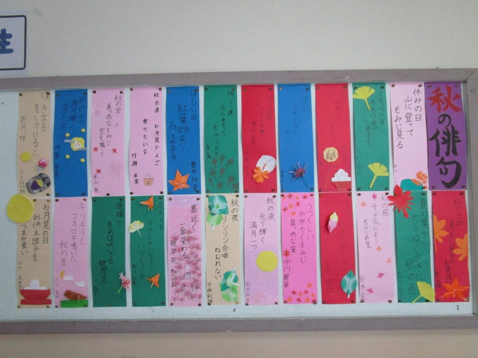 6年生の掲示板には、秋の俳句の作品が飾られています。秋の季語が使われ、折り紙や絵を添えて、秋らしさが漂っています。