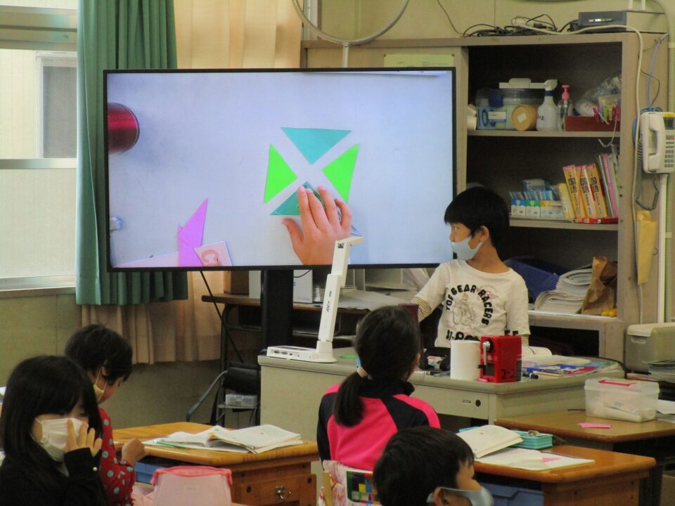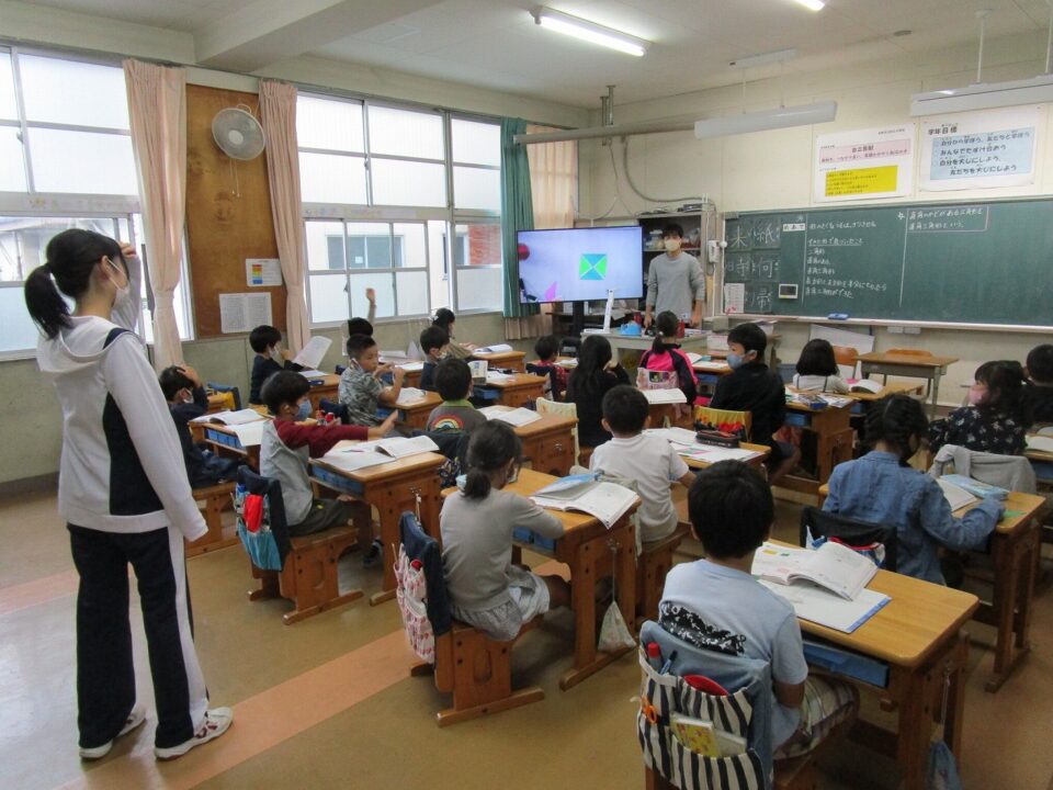2年2組では、算数でモニターを使って、学習していました。低学年では、将来の教師を目指す大学生ボランティアの人にもサポートしてもらっています。