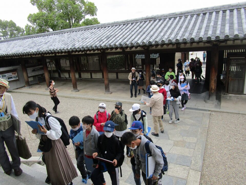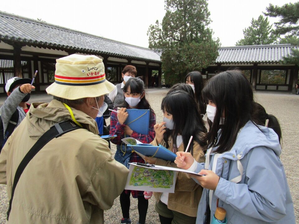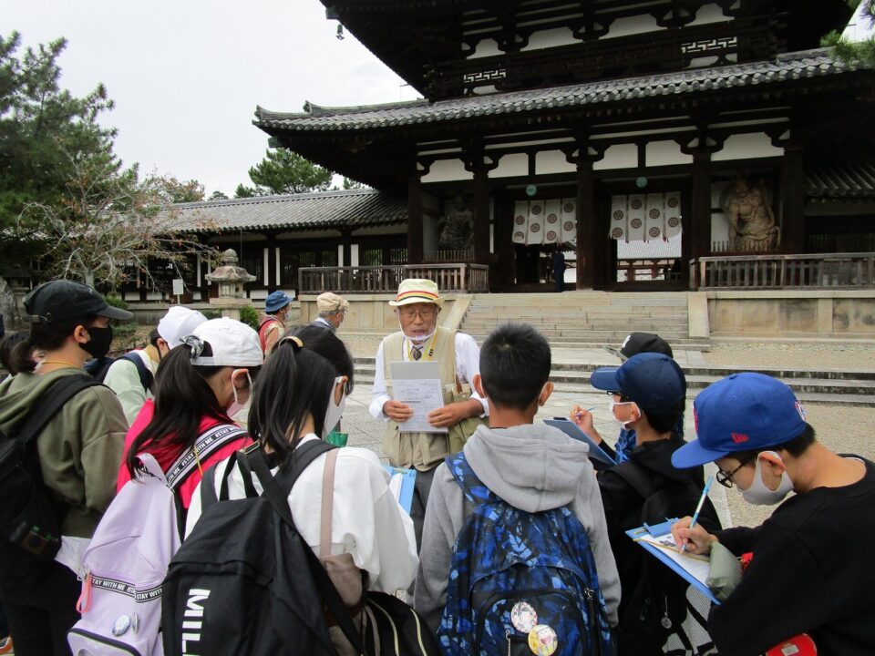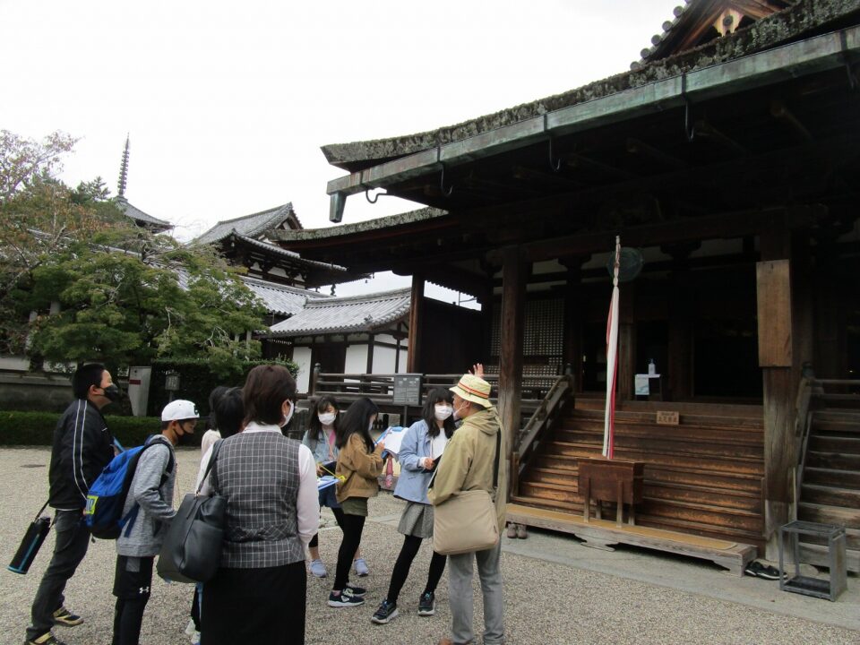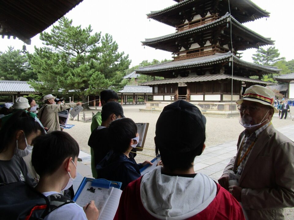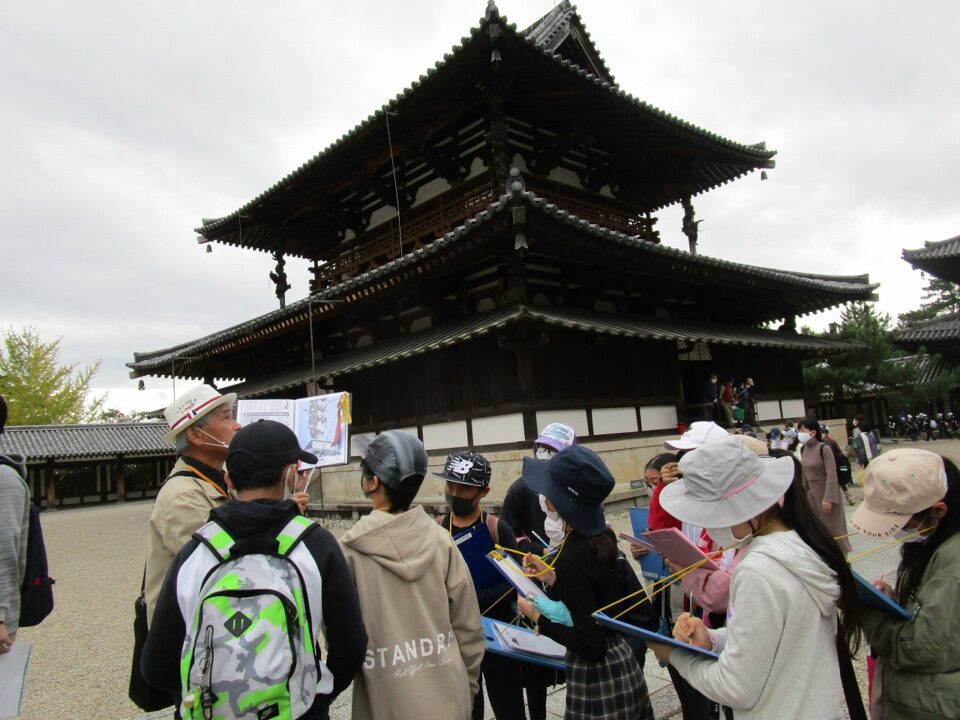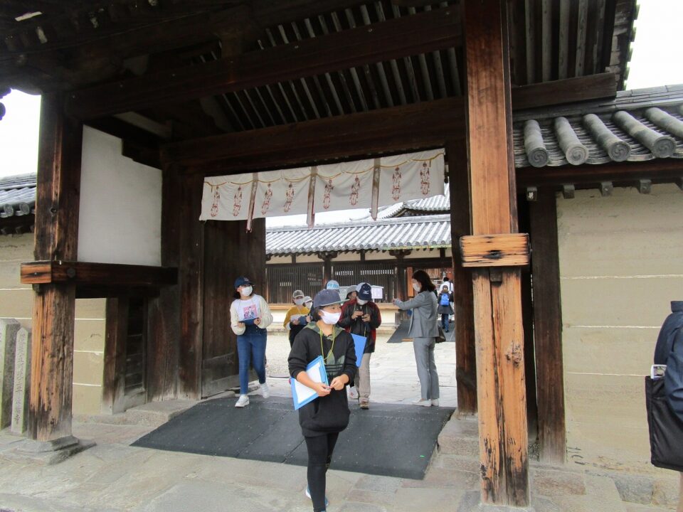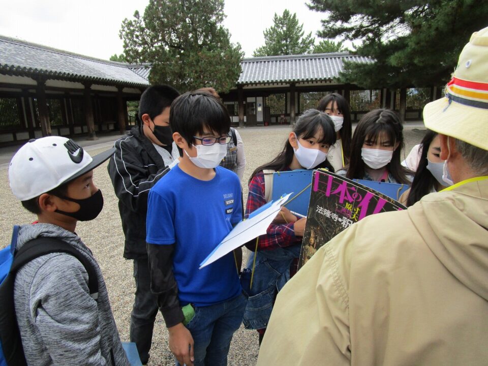 法隆寺では、各クラス3つのグループに分かれ、ガイドさん6人にそれぞれ案内、説明をしてもらいました。