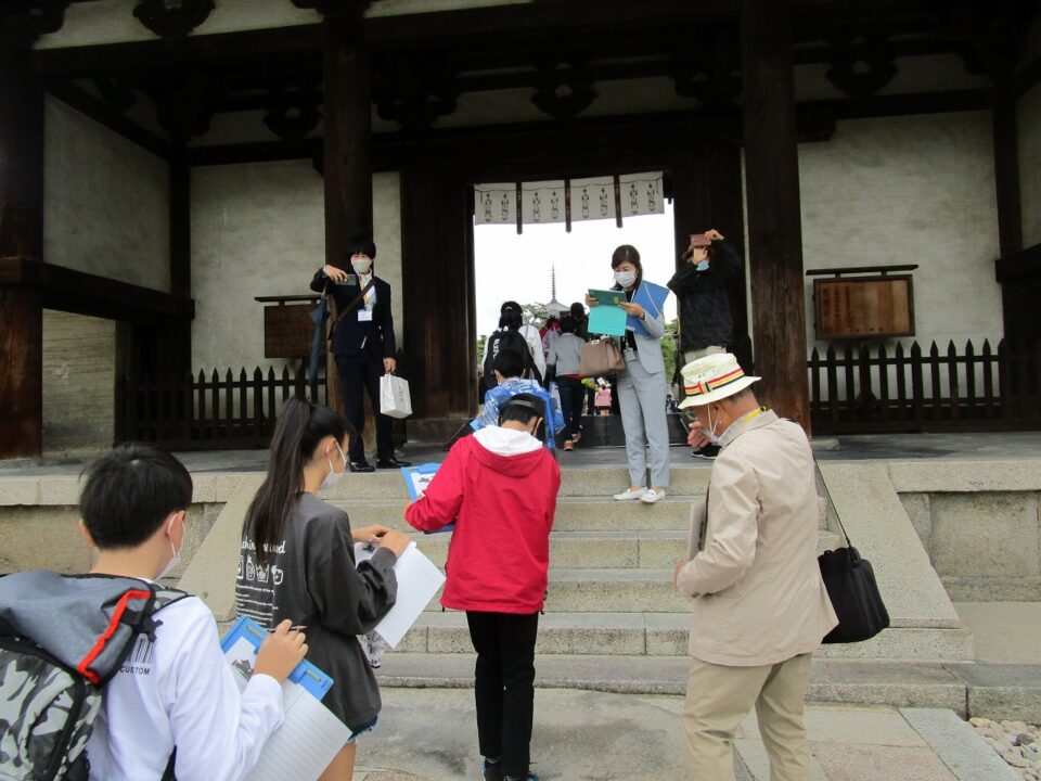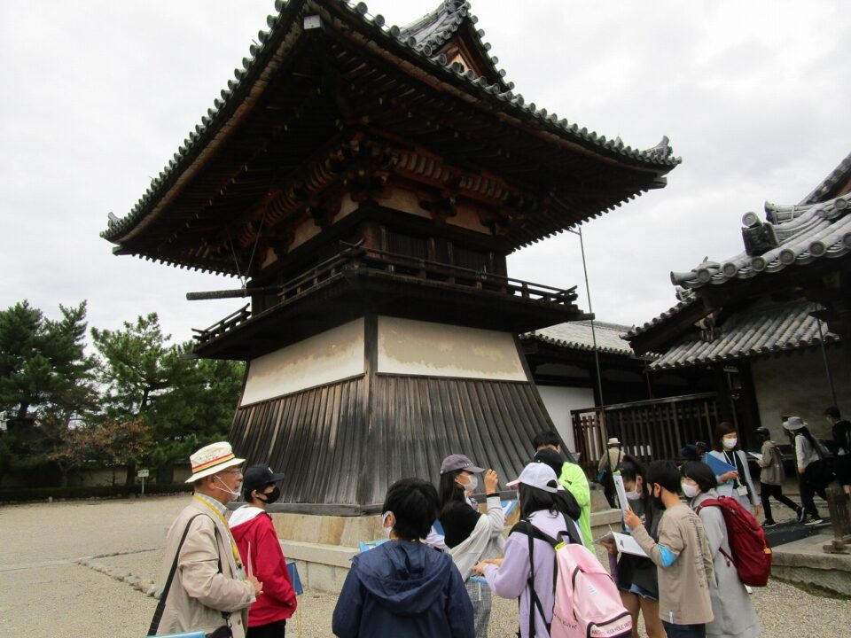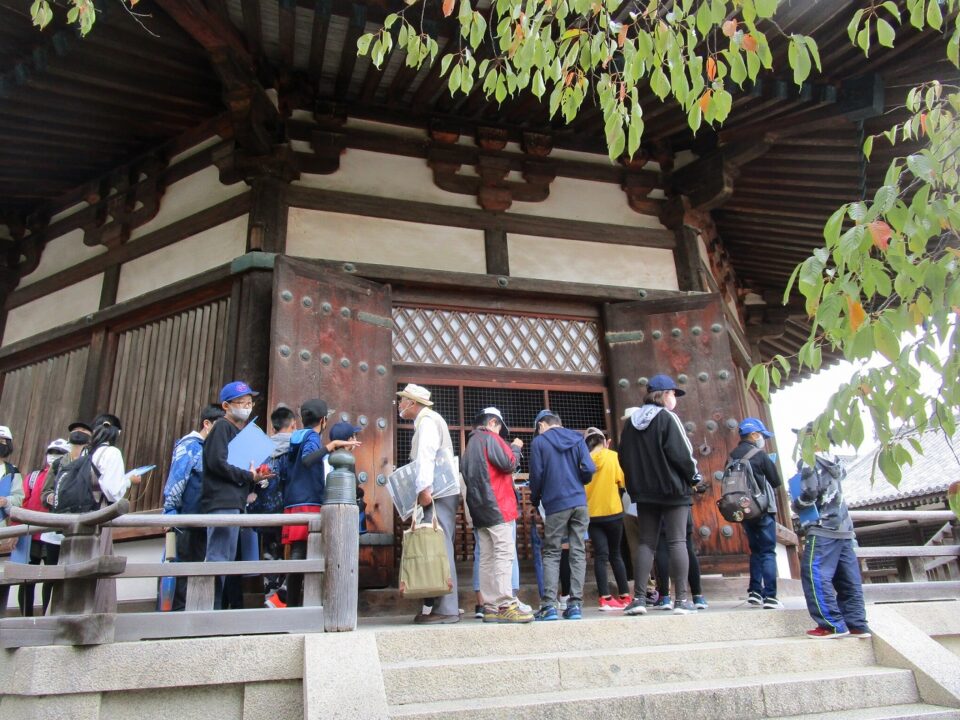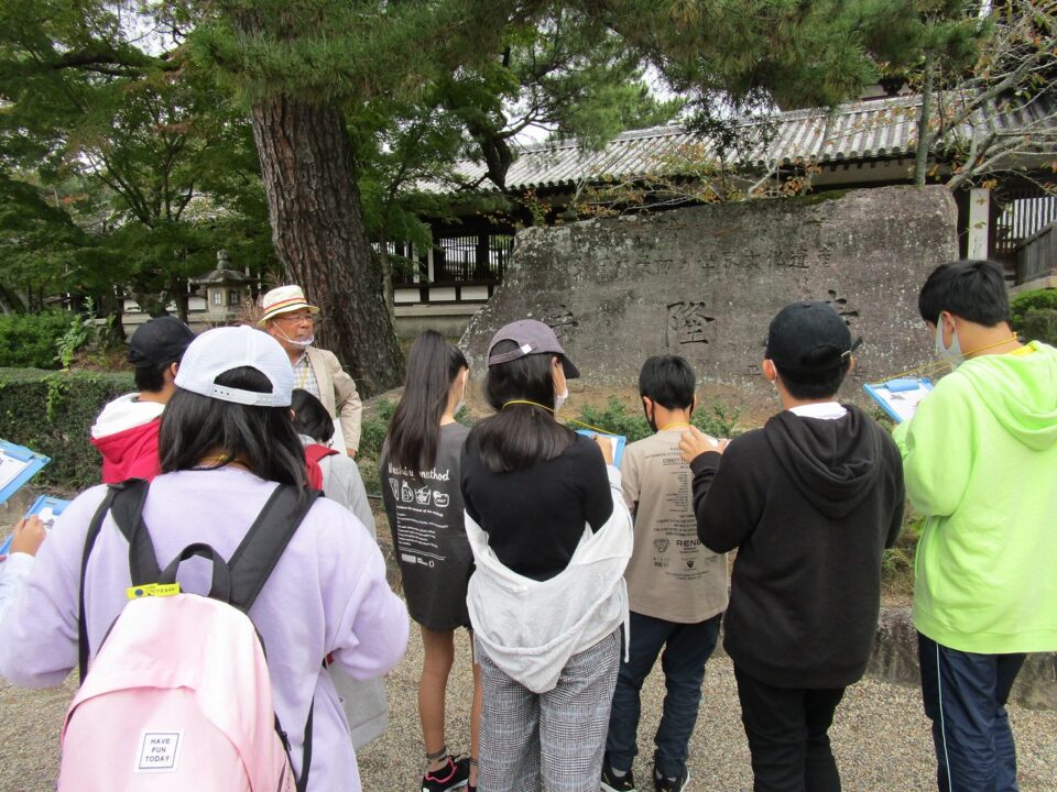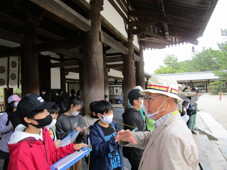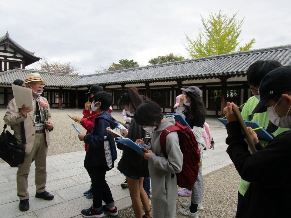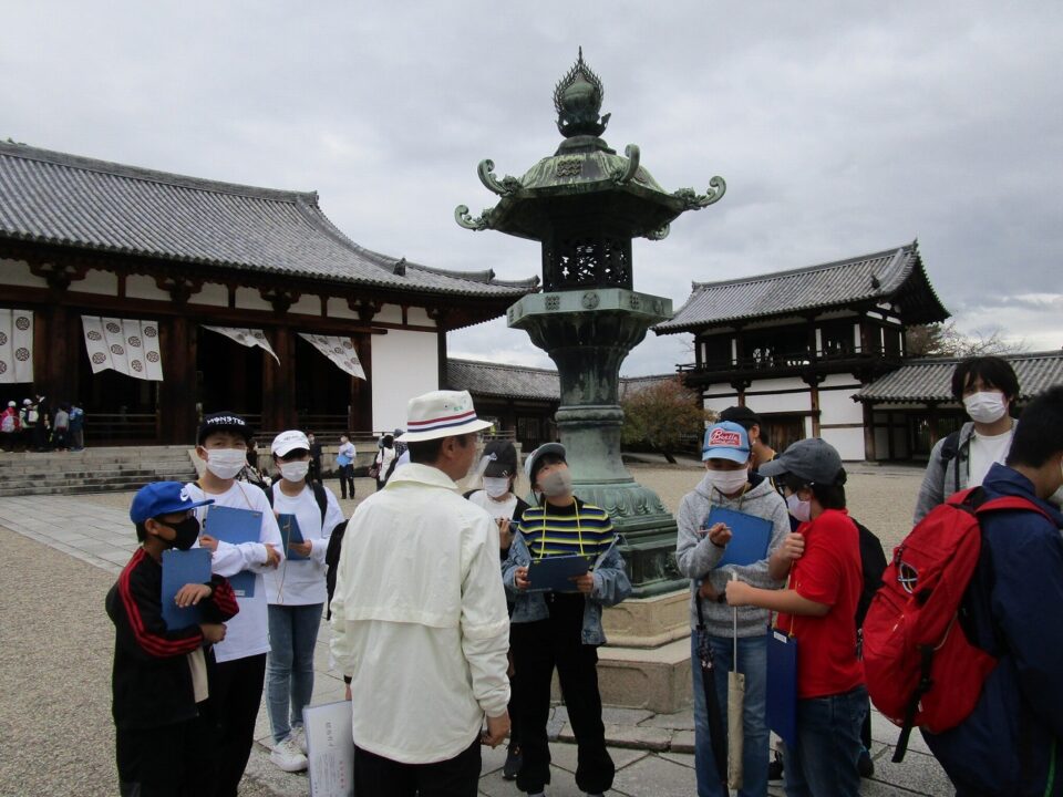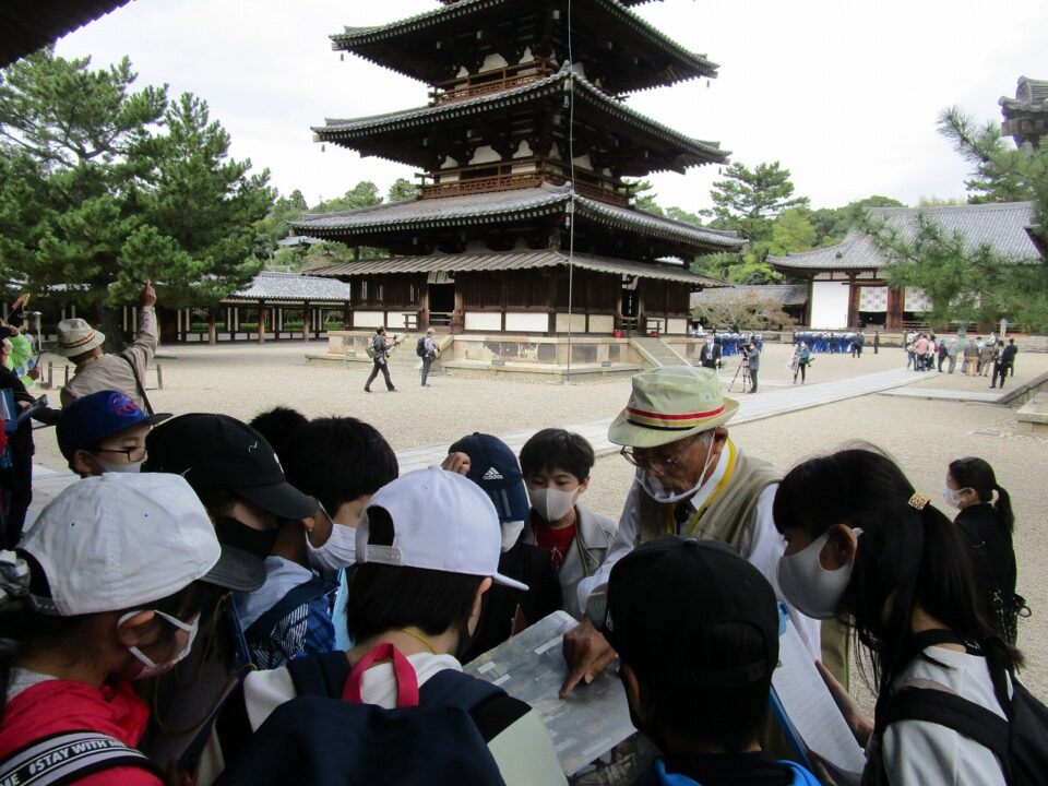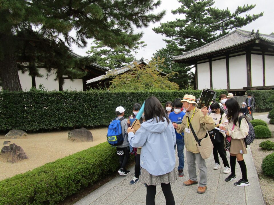 法隆寺では、各クラス3つのグループに分かれ、ガイドさん6人にそれぞれ案内、説明をしてもらいました。