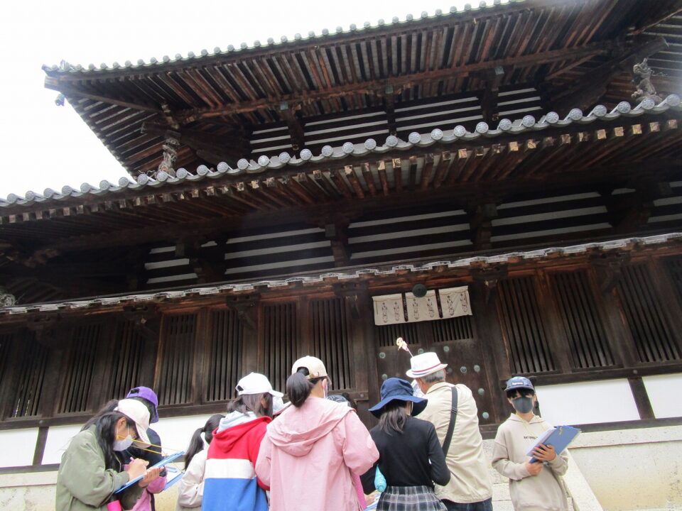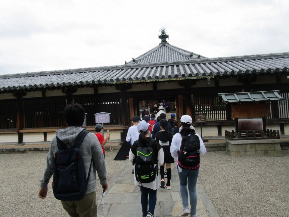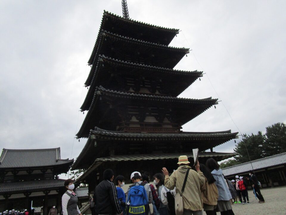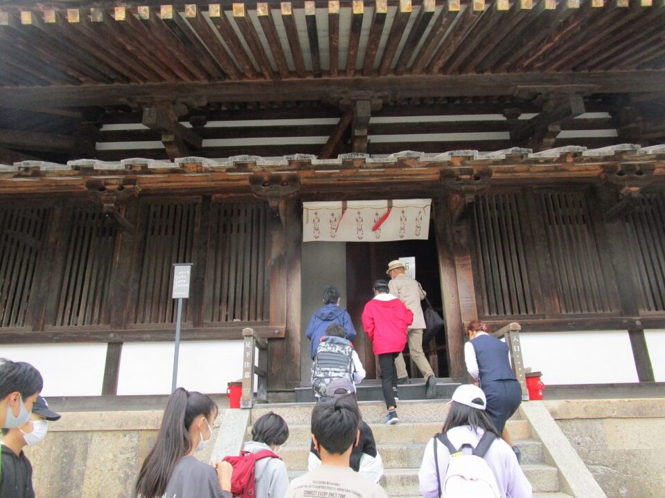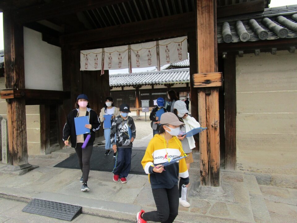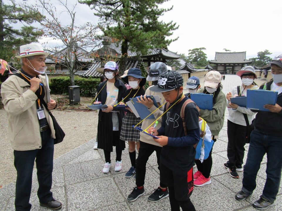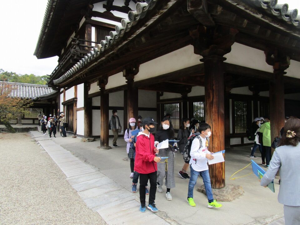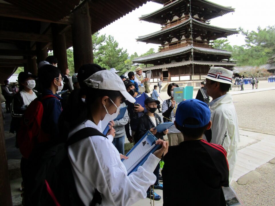 法隆寺では、各クラス3つのグループに分かれ、ガイドさん6人にそれぞれ案内、説明をしてもらいました。