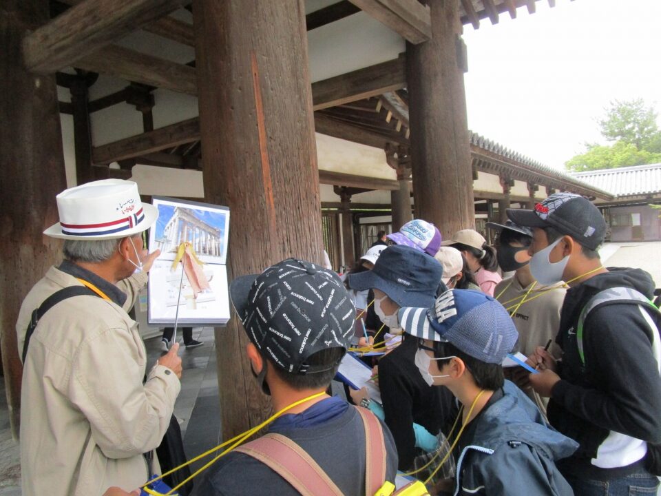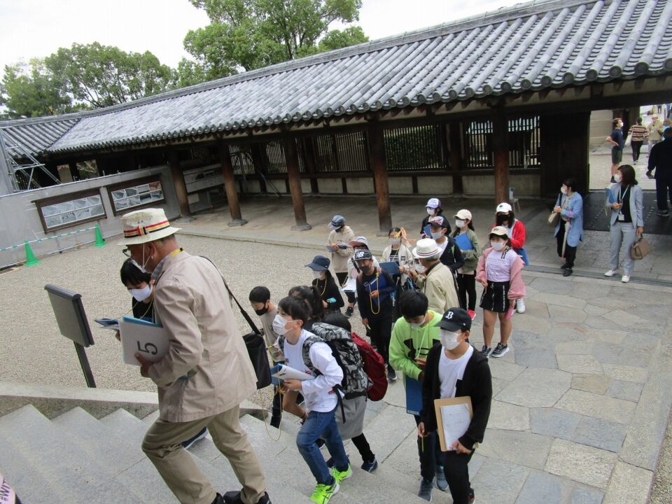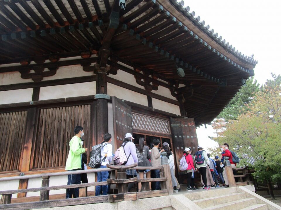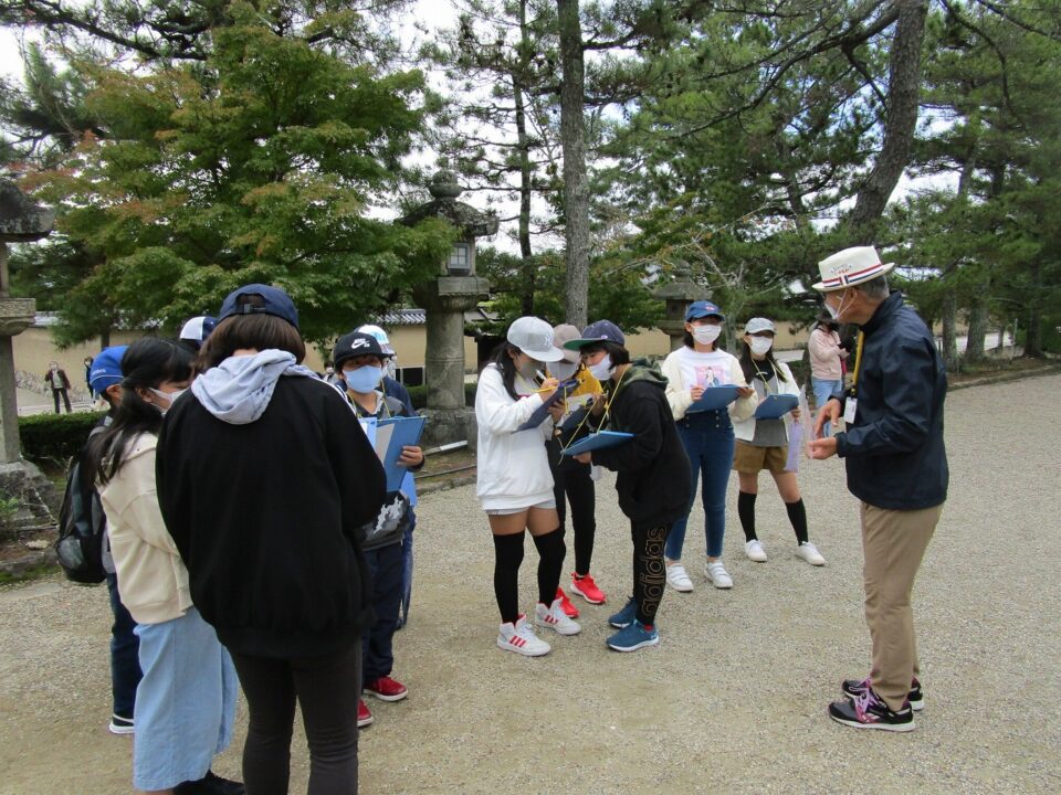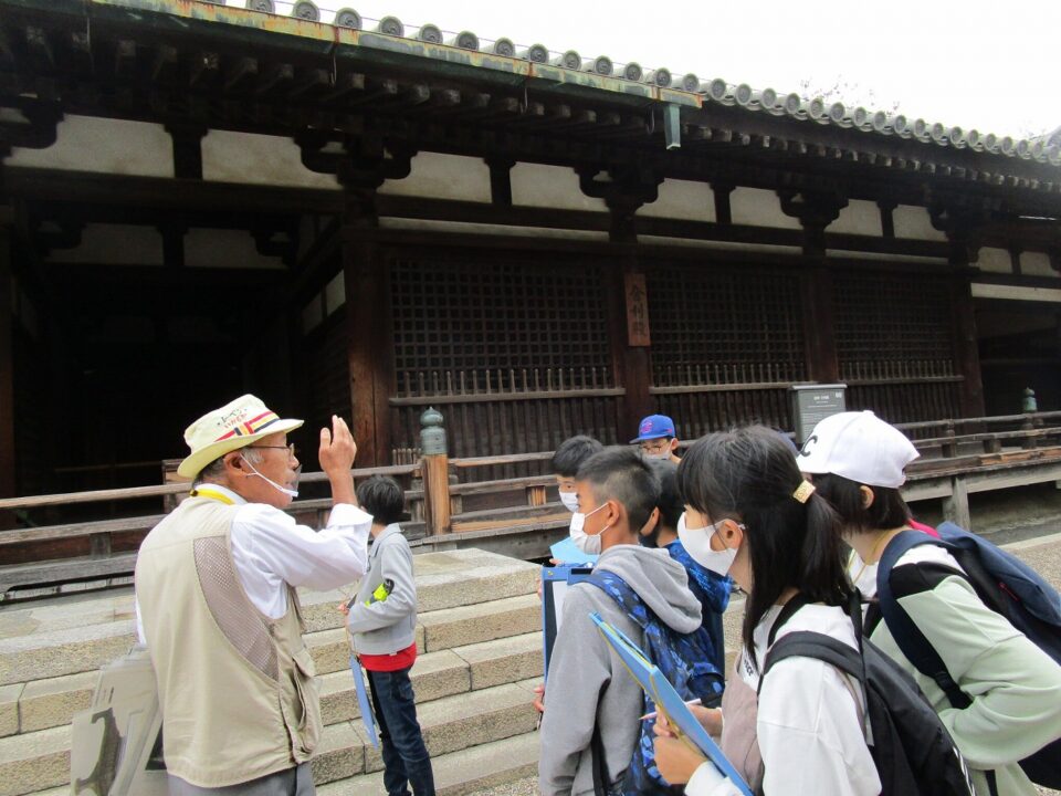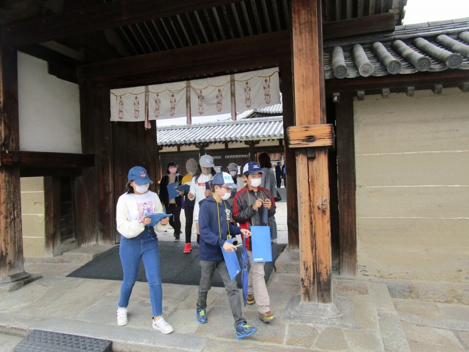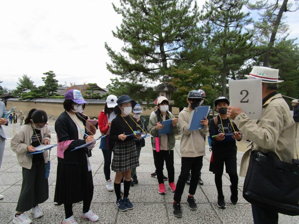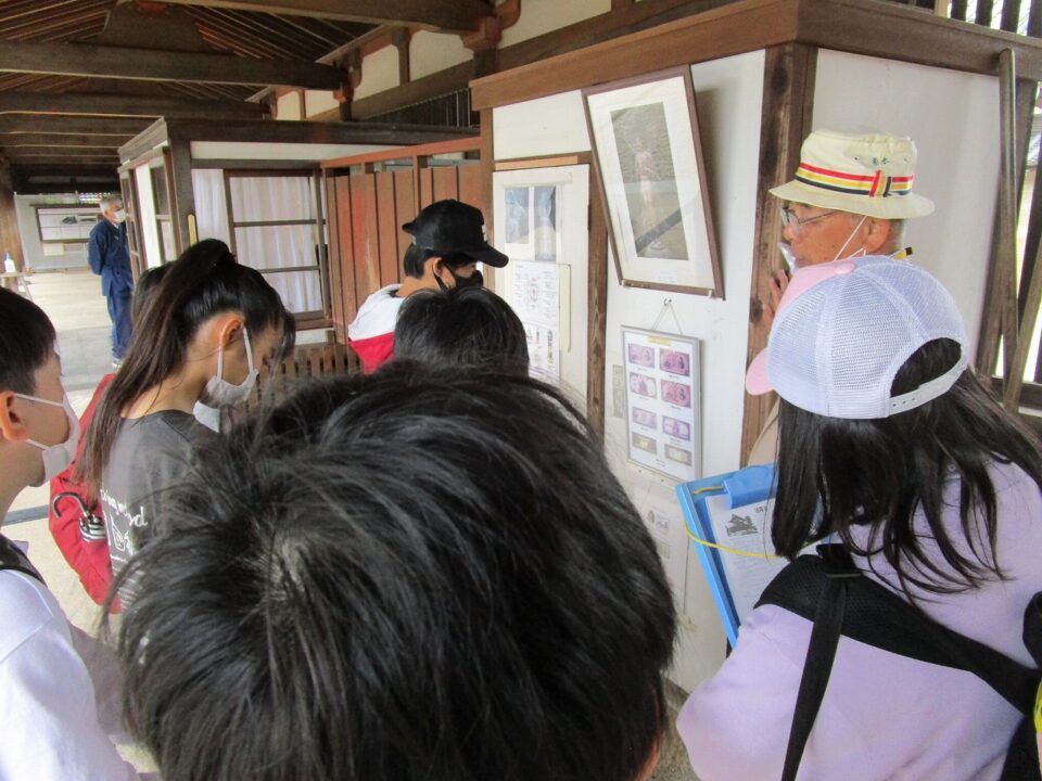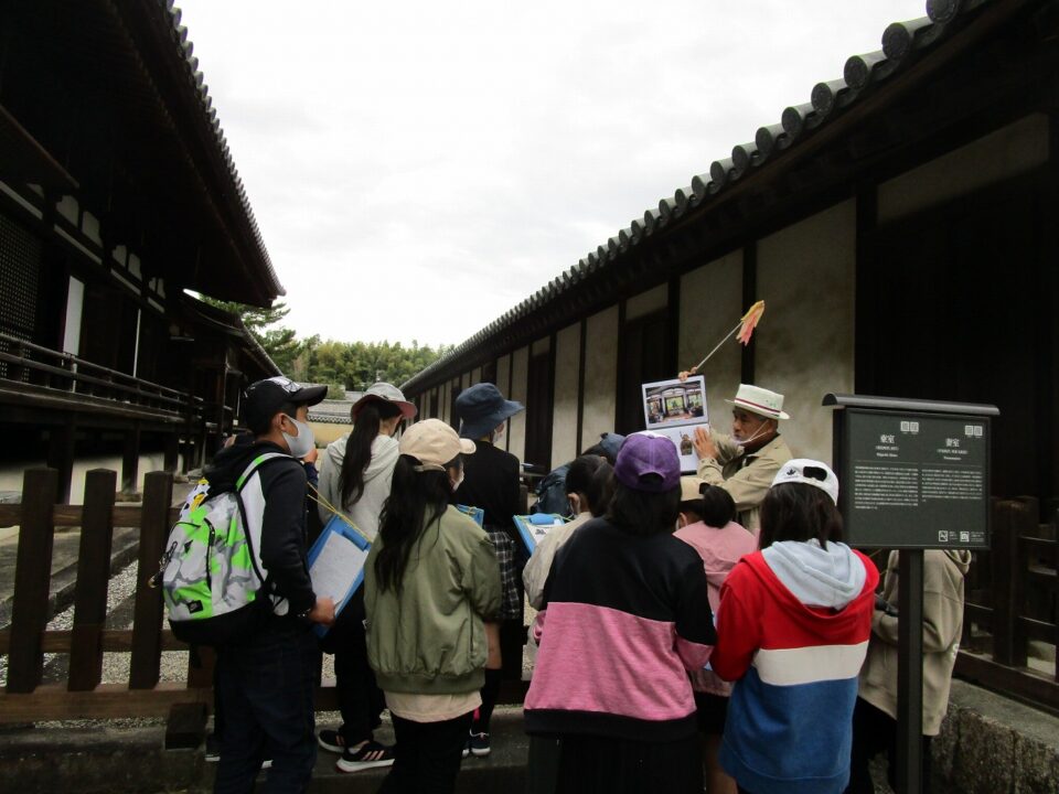法隆寺では、各クラス3つのグループに分かれ、ガイドさん6人にそれぞれ案内、説明をしてもらいました。