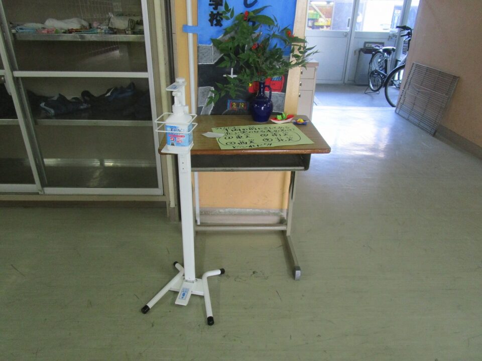 新型コロナ感染症対策として、足で踏んでアルコールが出て、消毒する「ペダル式アルコール消毒」を設置しました。