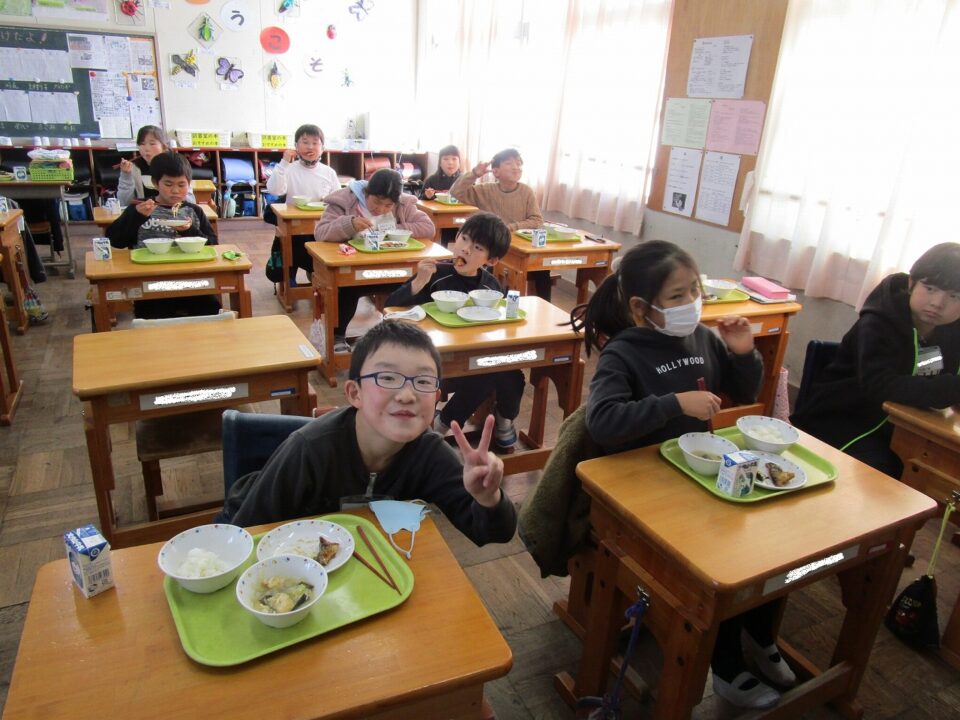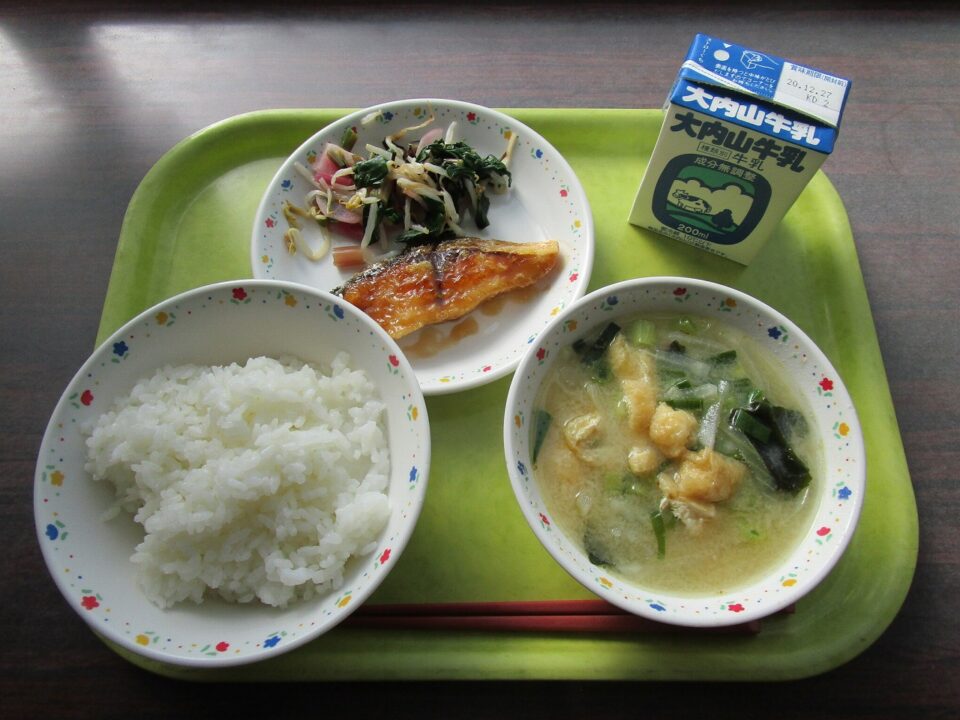 献立は、ご飯、牛乳、ぶりのてり煮、松阪赤菜の塩昆布和え 白みそ汁です。