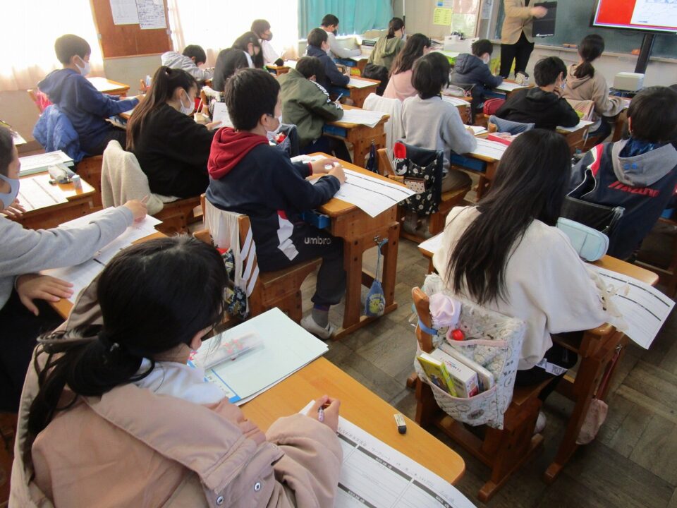 各班のプレゼンが終わるとワークシートに①工夫しているところ ②アドバイス(さらにこうするとステキに!)をメモしていきます。