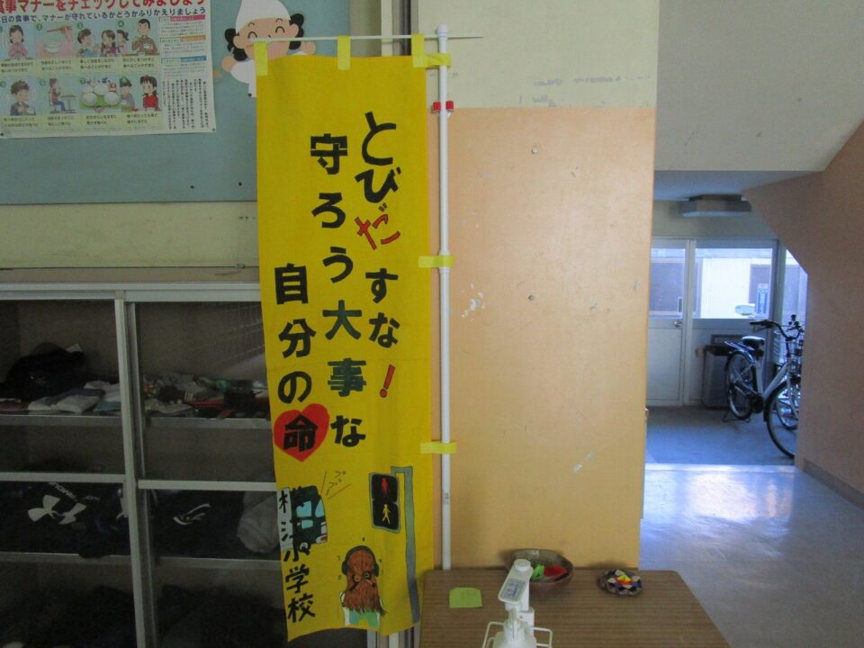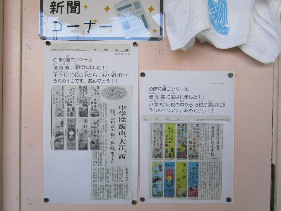 休憩時間きゅうけいじかん使つかって、児童会じどうかいたちが一生懸命いっしょうけんめい作成さくせいしたのぼりばた優秀賞ゆうしゅうしょうえらばれました。