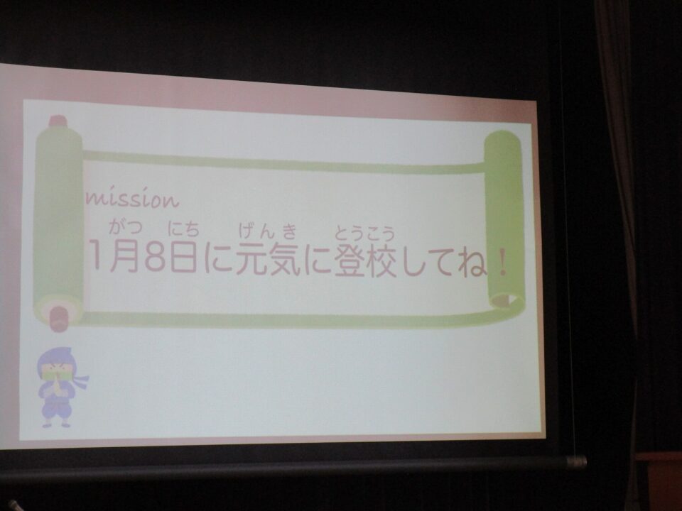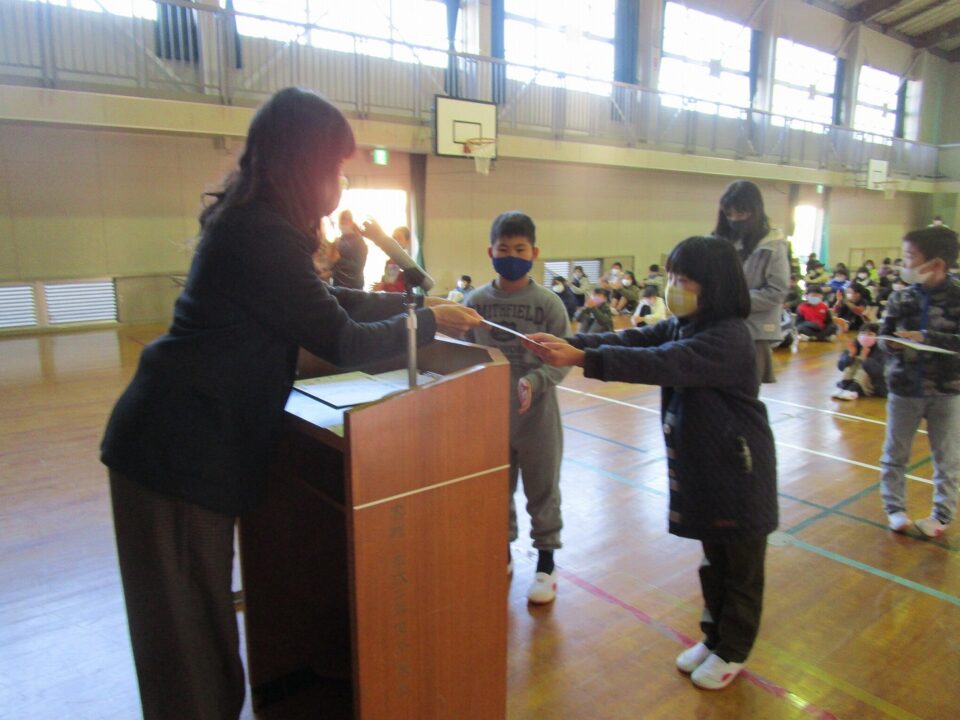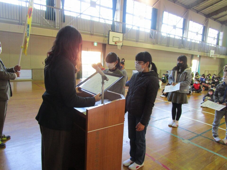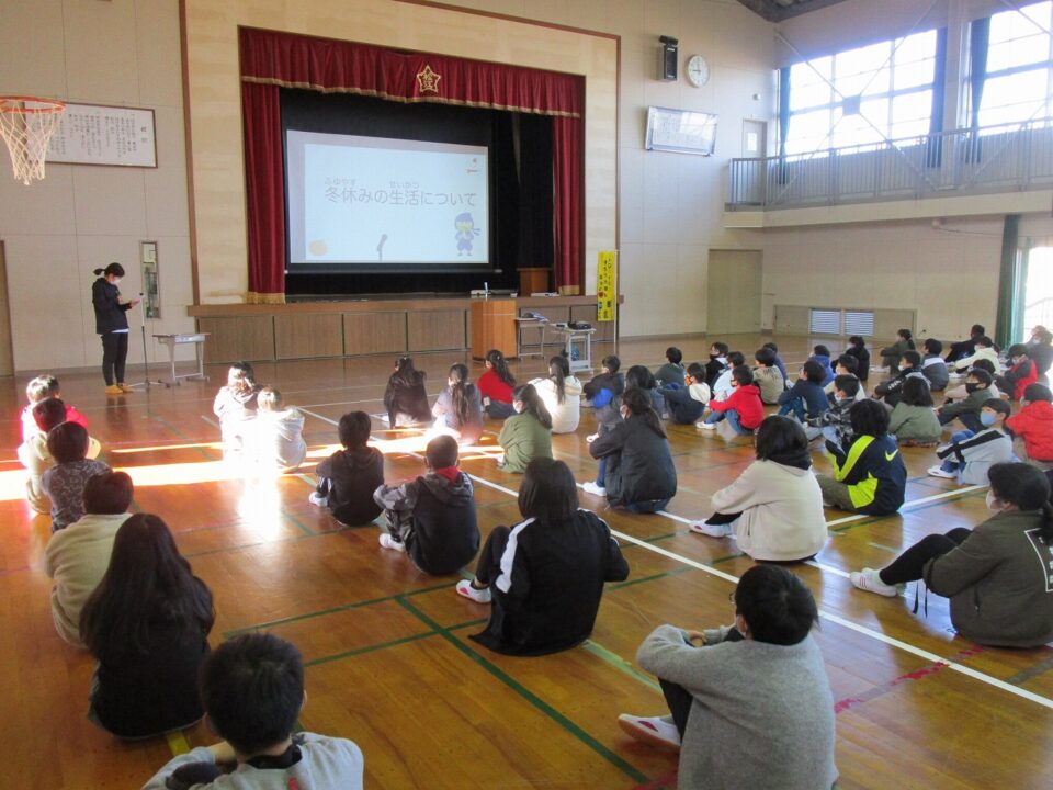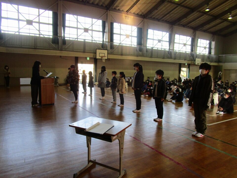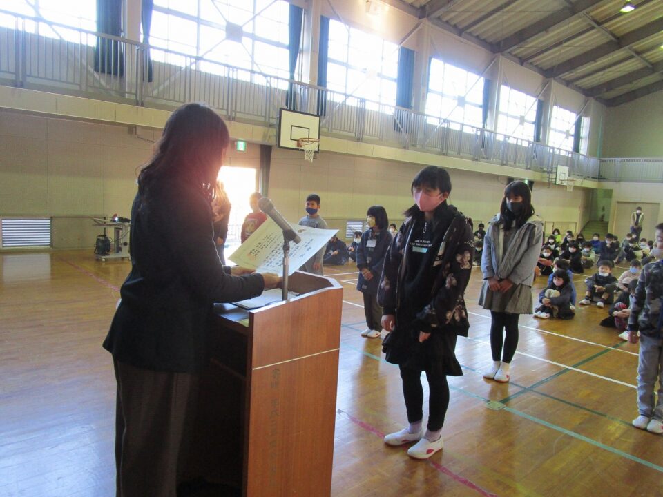 冬休み前集会での内容は、校長先生の話・生活指導の話・保健室からの話・表彰式・鏡先生とのお別れの会でした。