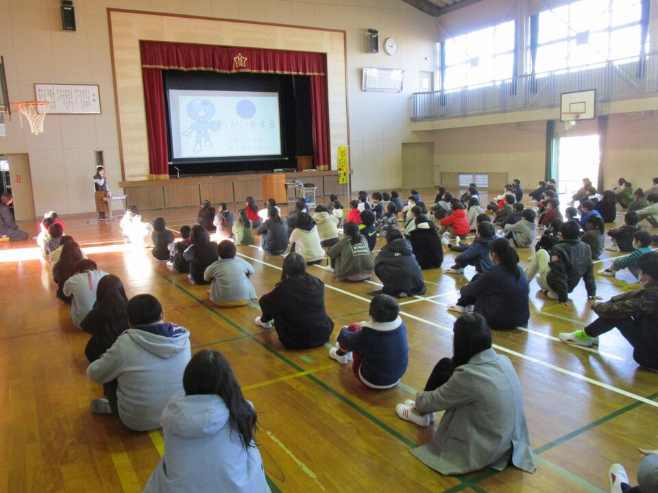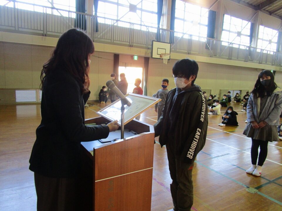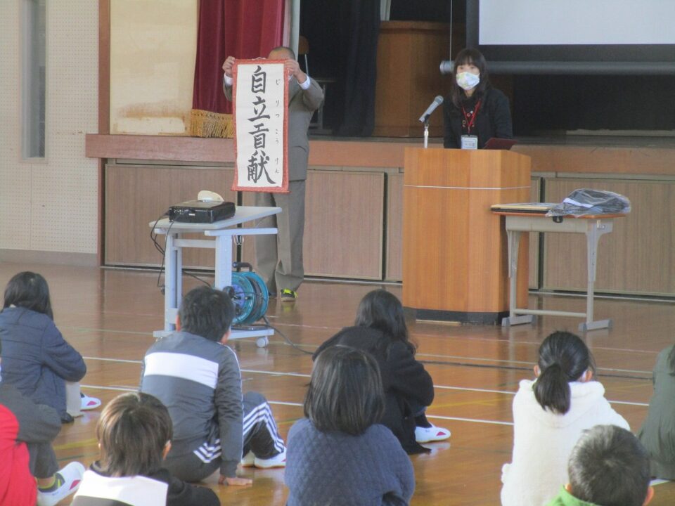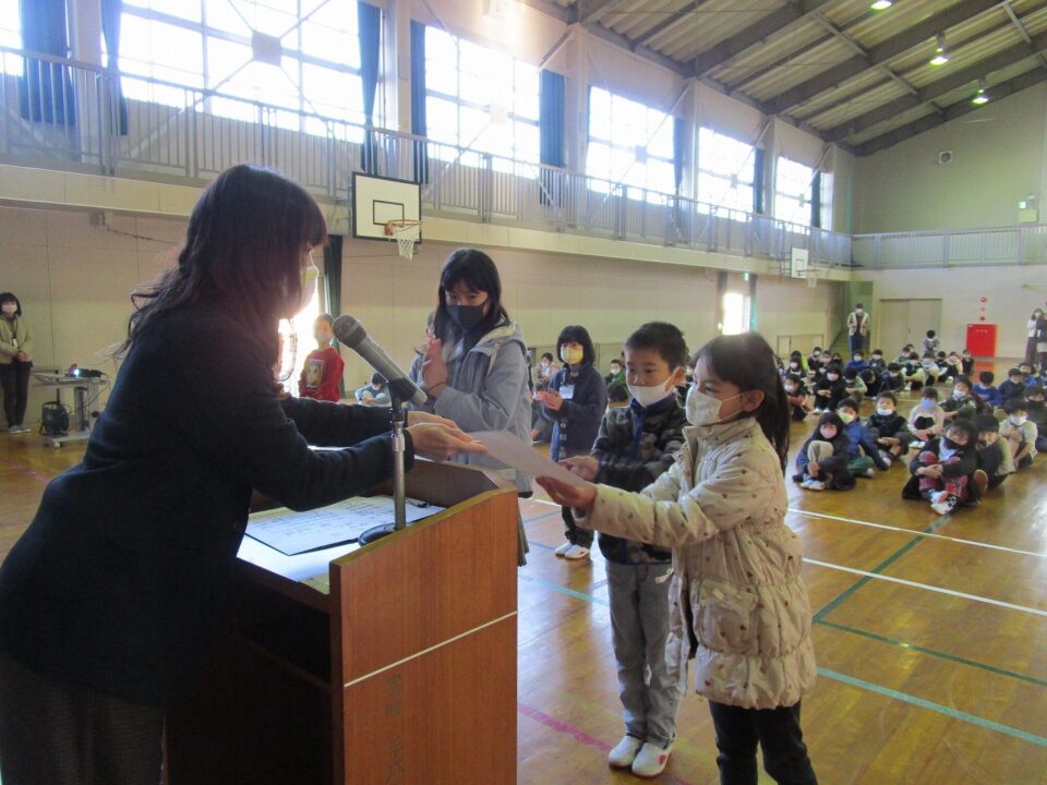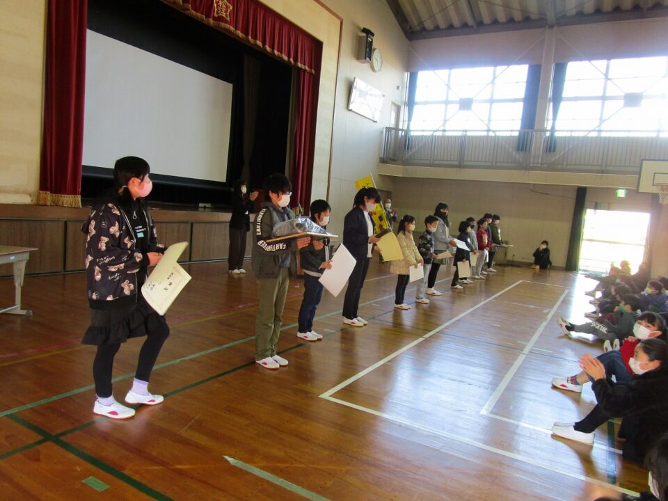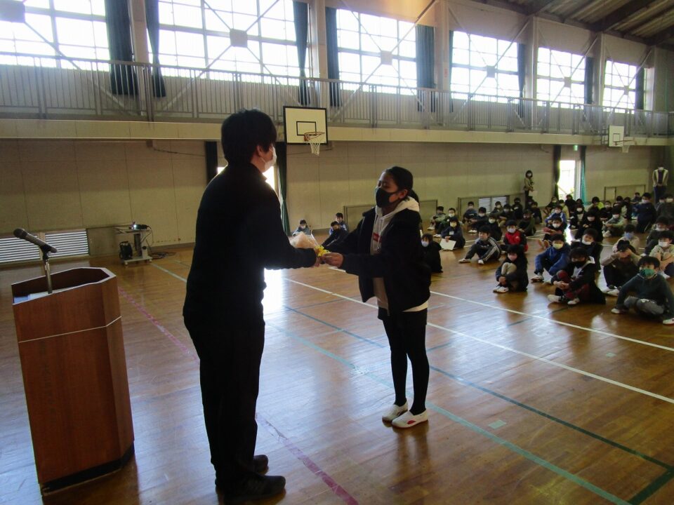 冬休み前集会での内容は、校長先生の話・生活指導の話・保健室からの話・表彰式・鏡先生とのお別れの会でした。