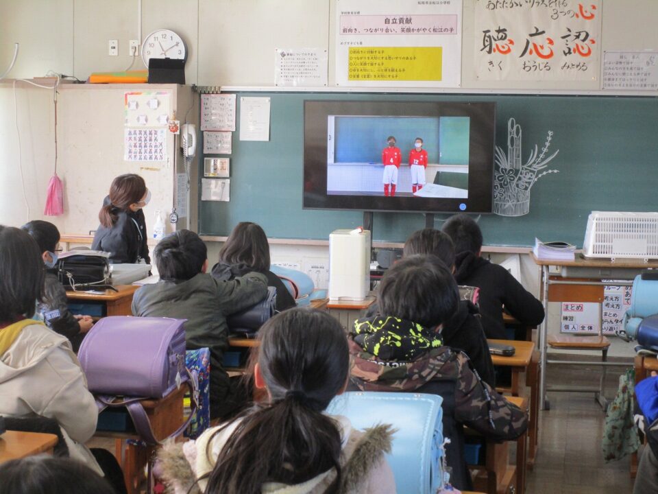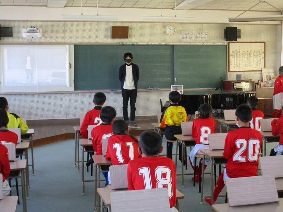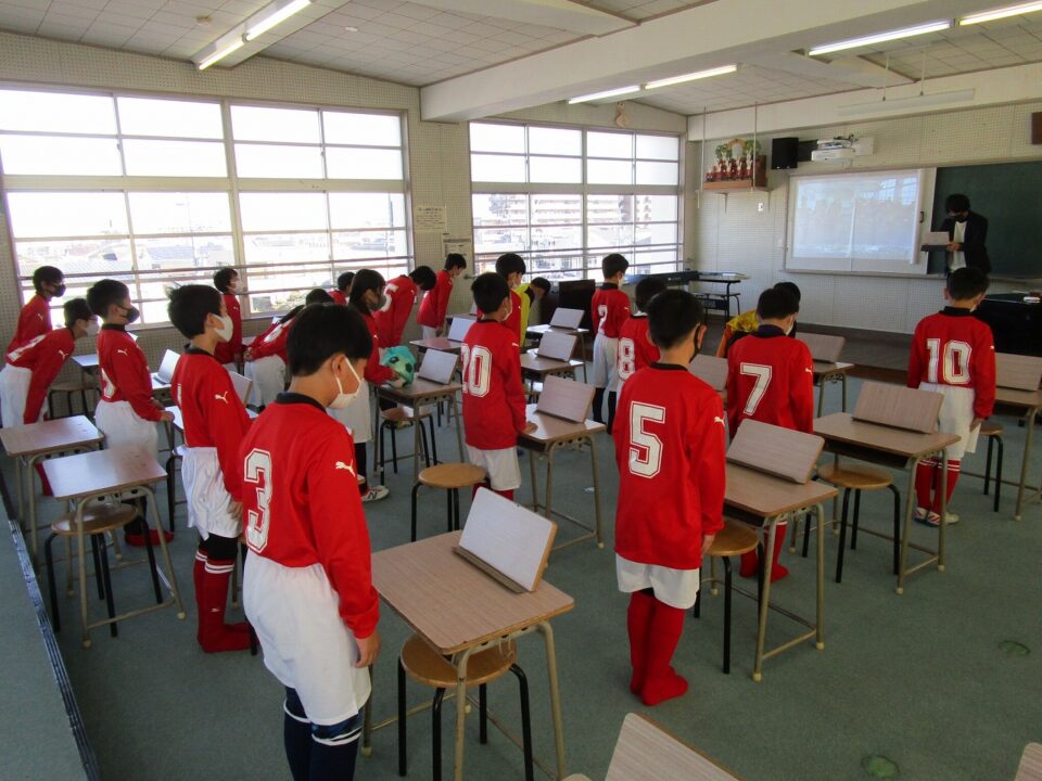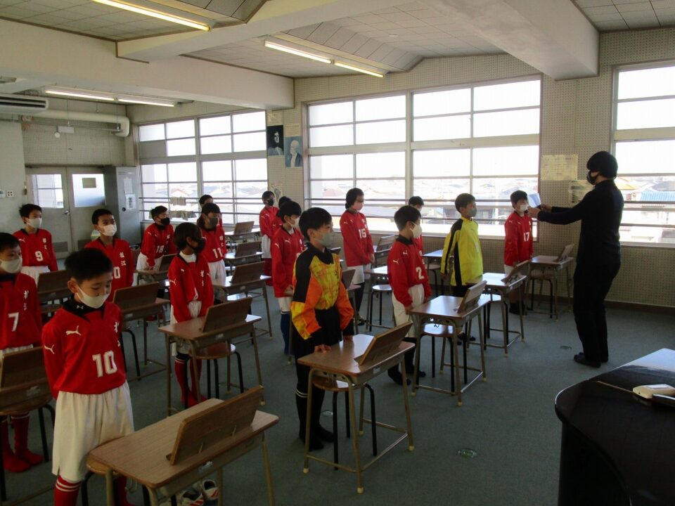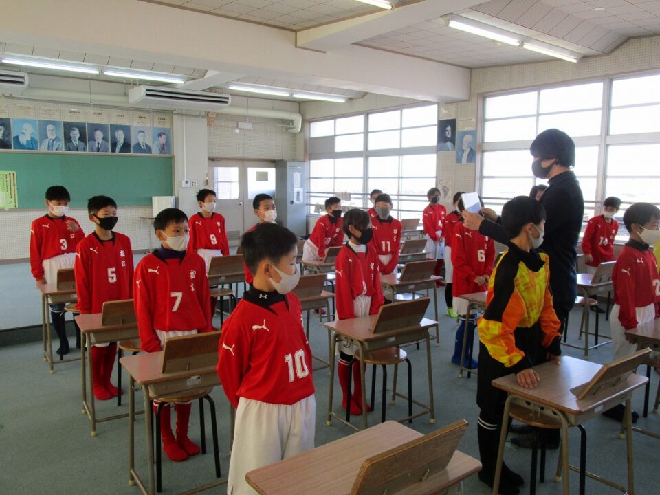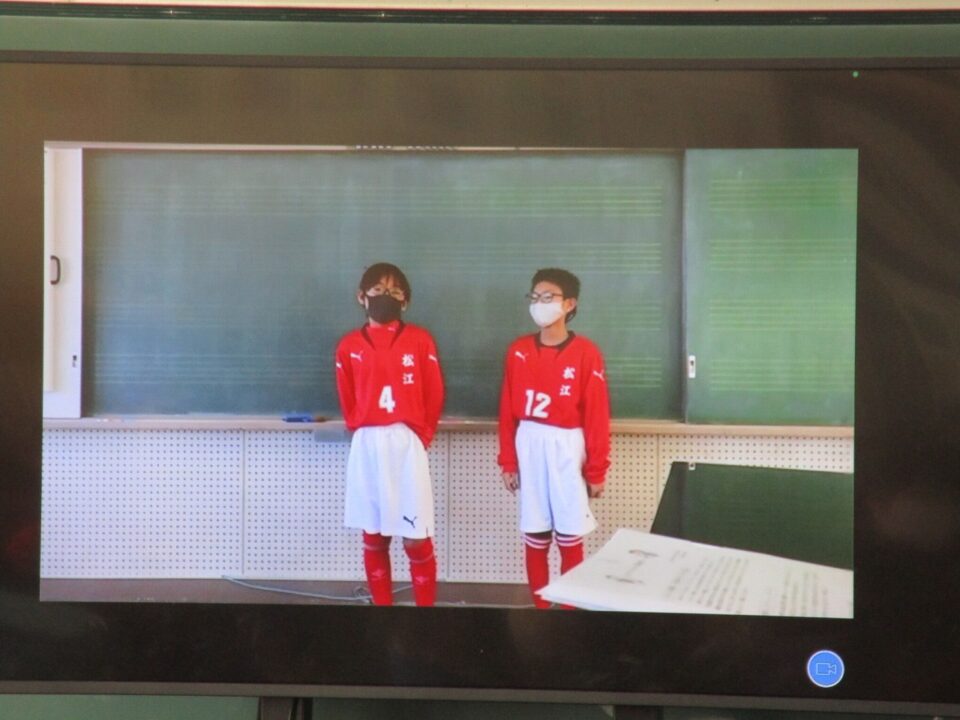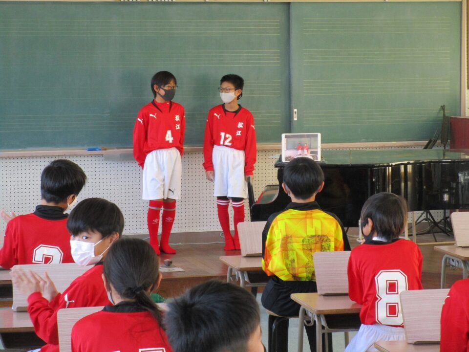 サッカー壮行会そうこうかいおこなわれました。試合しあい時間じかんは、本日配付ほんじつはいふの『かがやきHarmony』におらせしてあります。松江小まつえしょうからは2チーム出場しゅつじょうします。最後さいごまであきらめずにボールをいかけ、がんばってきてください。