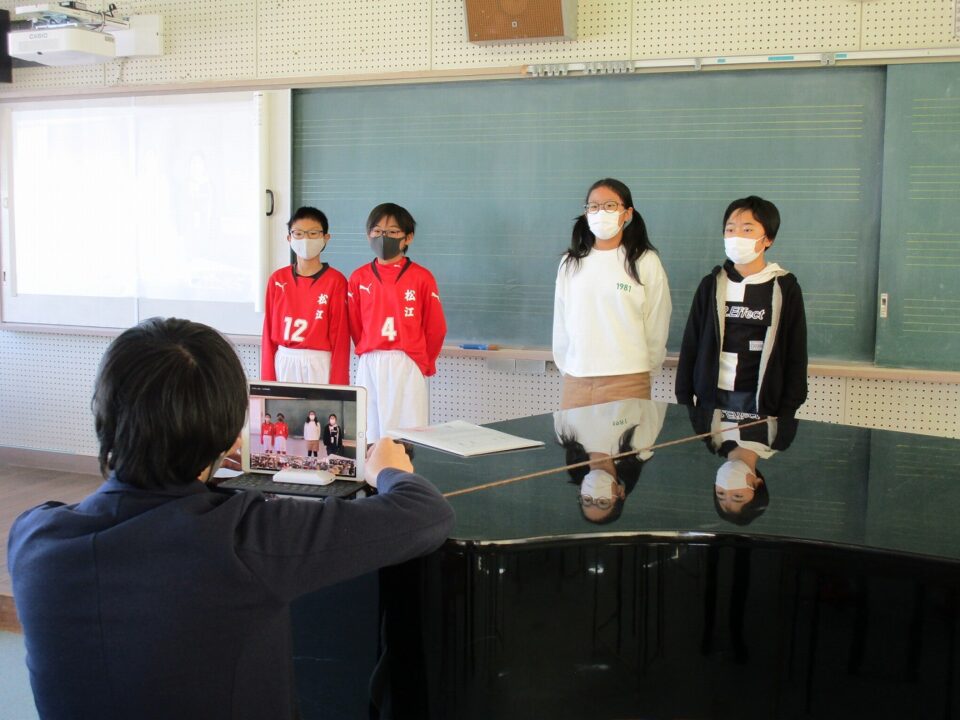 みんなではあつまれないので、Zoomで音楽室おんがくしつから各教室かくきょうしつ配信はいしんしました。