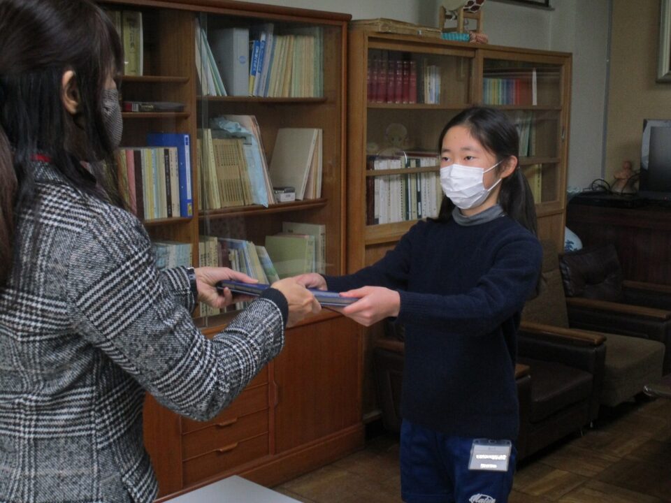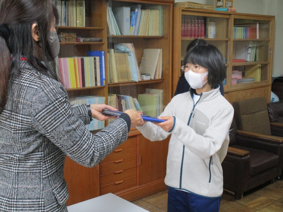 Zoomによって、校長室から配信し、6年生の代表に手渡され、その後みんなは、時間を設けて各クラスで担任の先生から手渡されました。