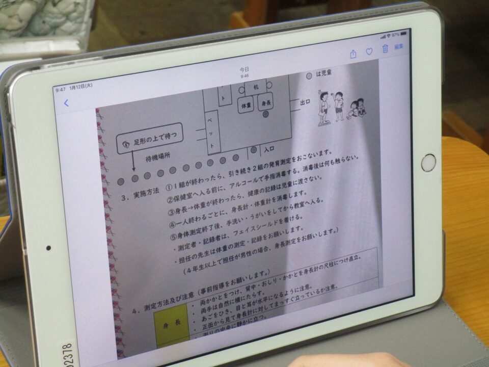 さっそく、身体測定の説明書がみんなのiPadに配られ、それを見ながら説明を受けていました。