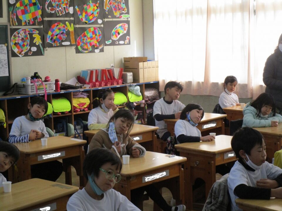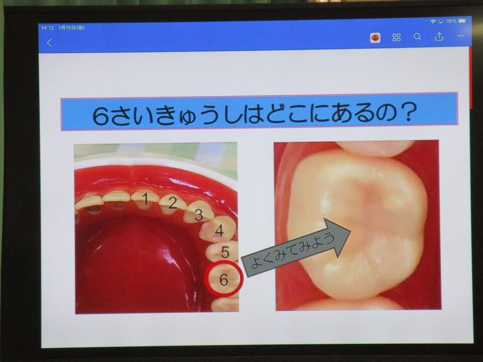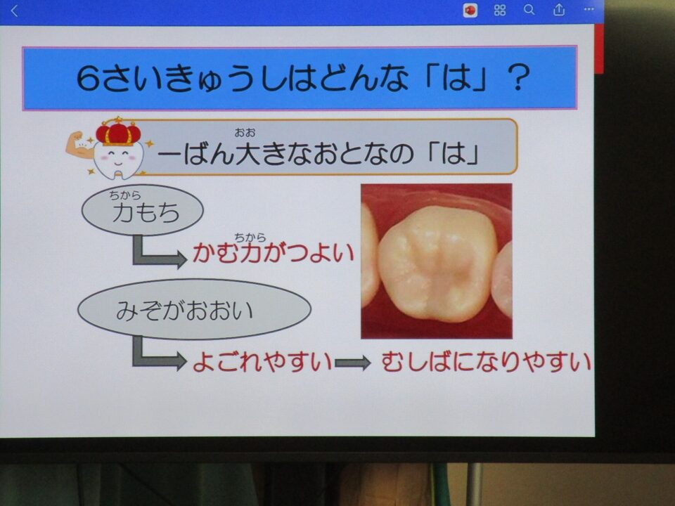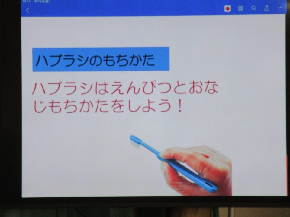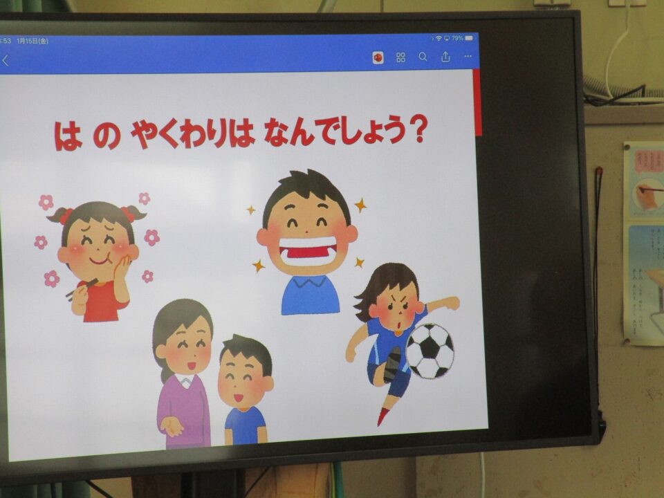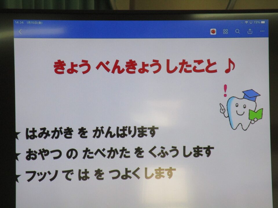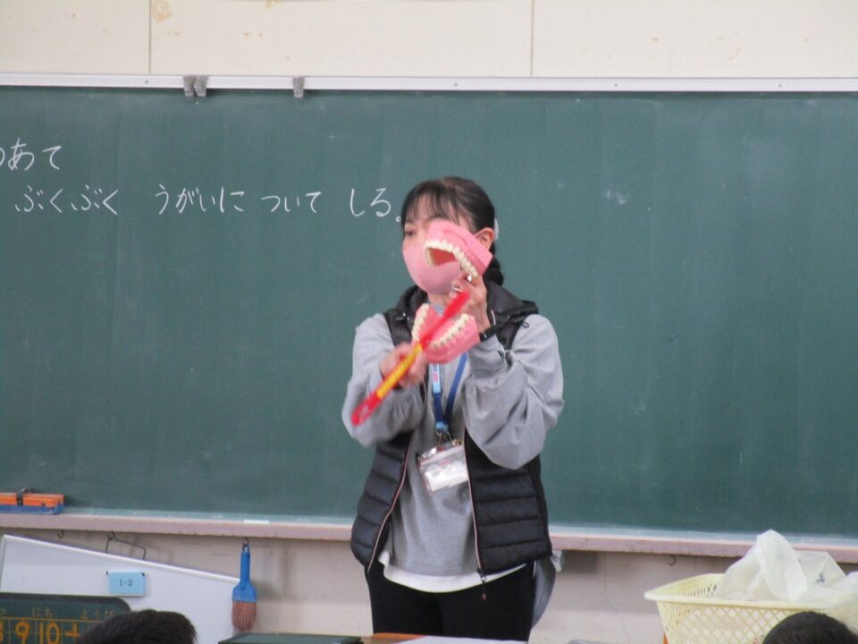 今日は、教育委員会と健康づくり課から教えに来てもらい、ぶくぶくうがいの仕方や歯みがきの大切さを学びました。
