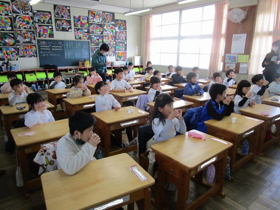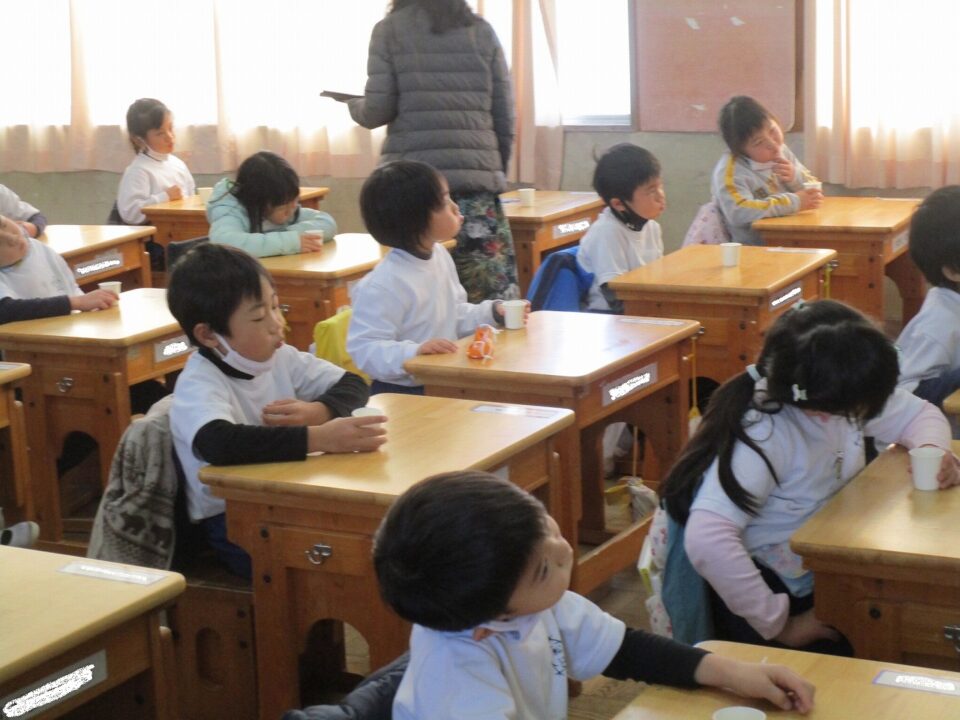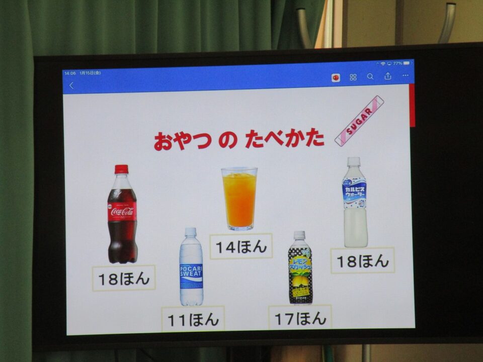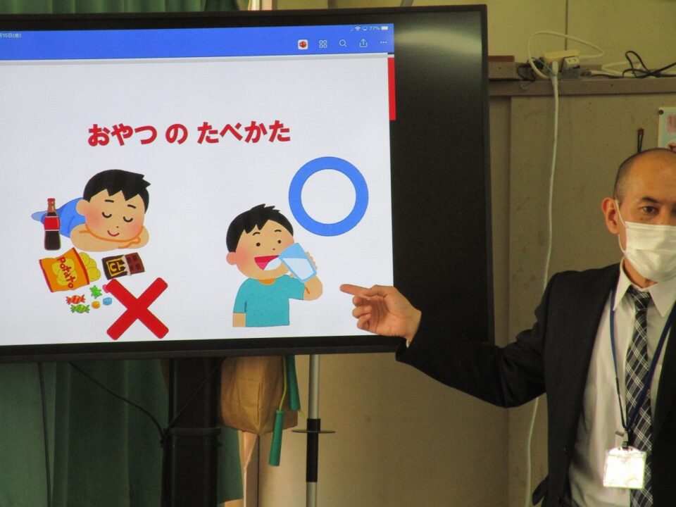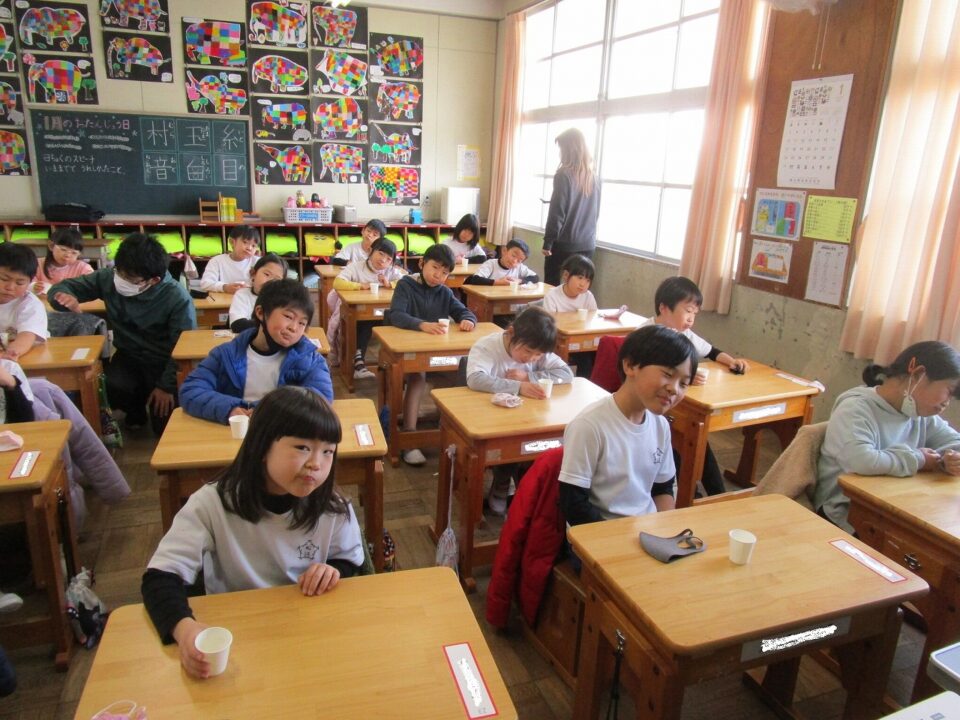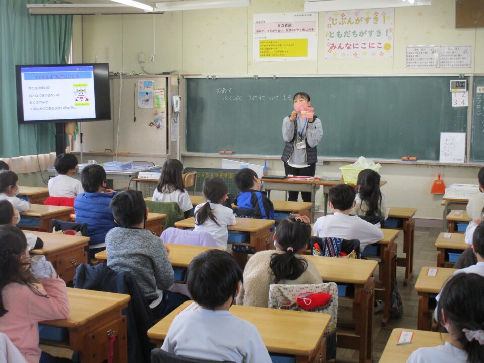 今日は、教育委員会と健康づくり課から教えに来てもらい、ぶくぶくうがいの仕方や歯みがきの大切さを学びました。