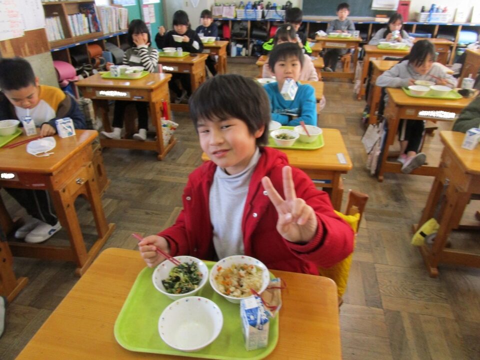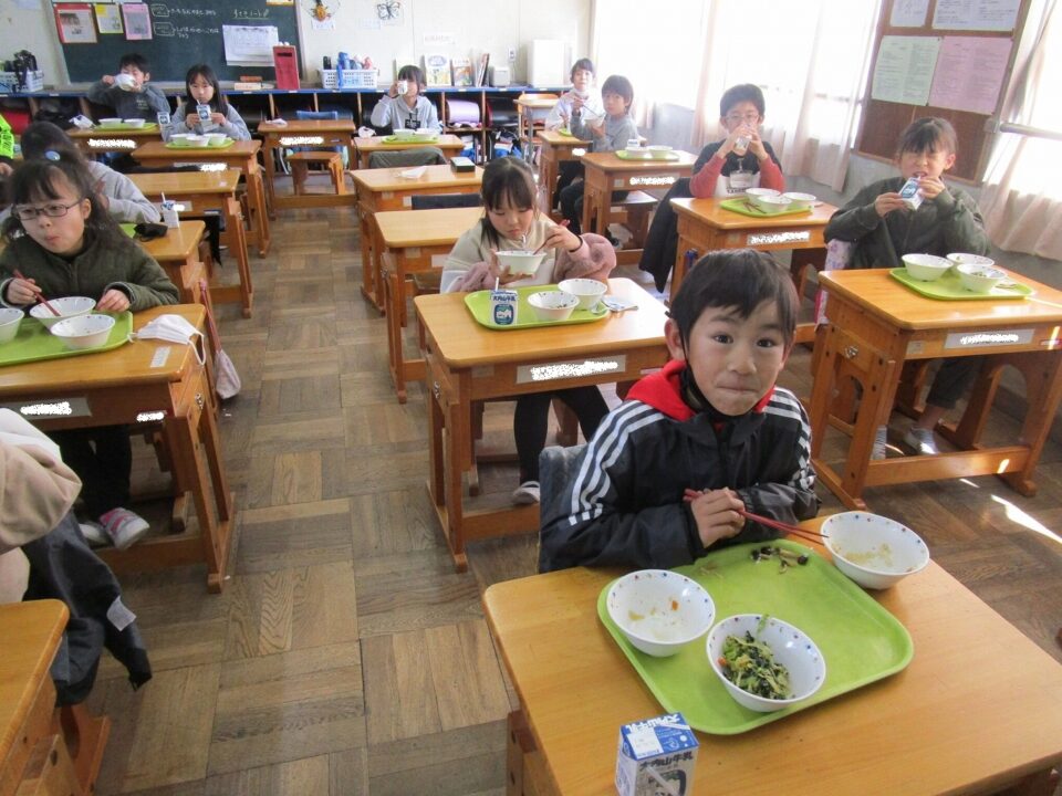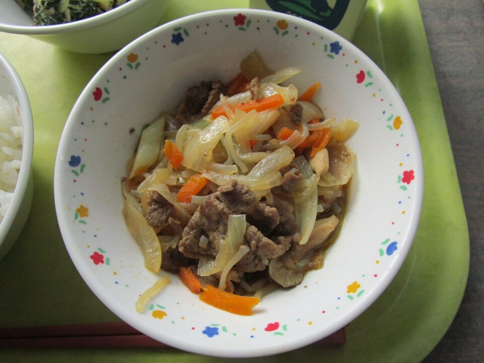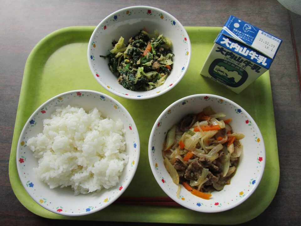 今日の献立は、ごはん、牛乳、松阪牛のすき煮、ほうれん草ののり酢和え でした。