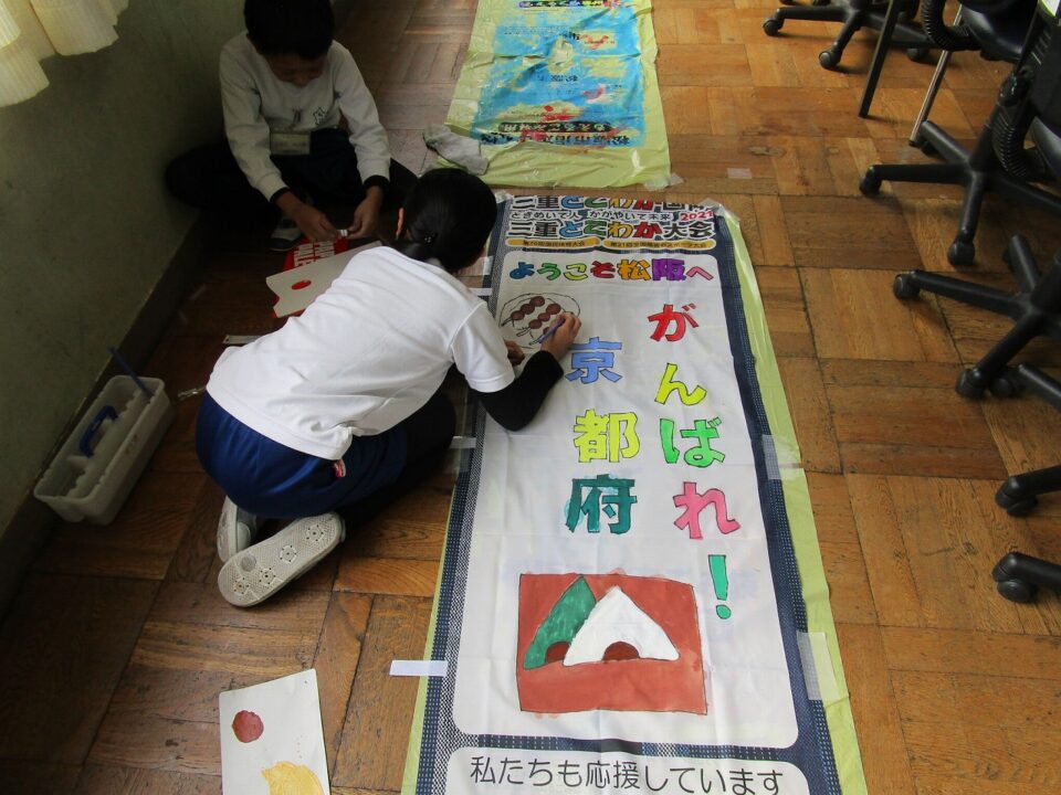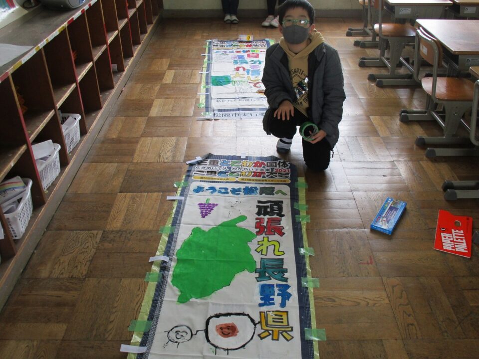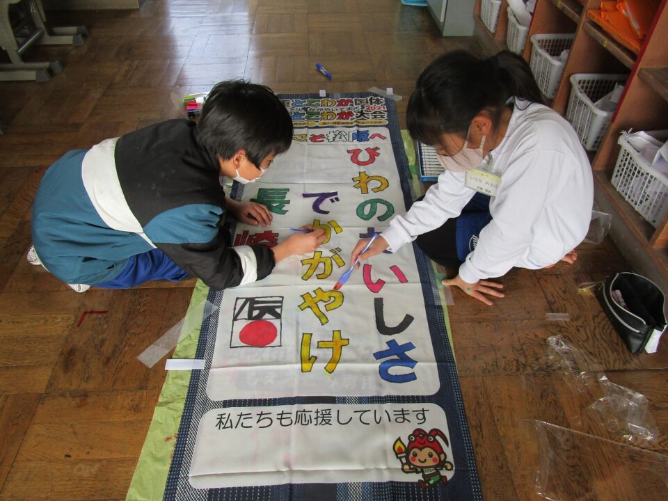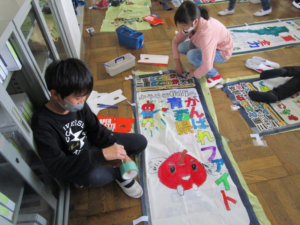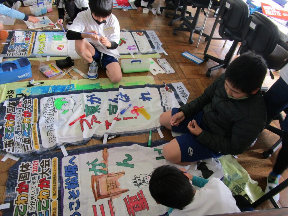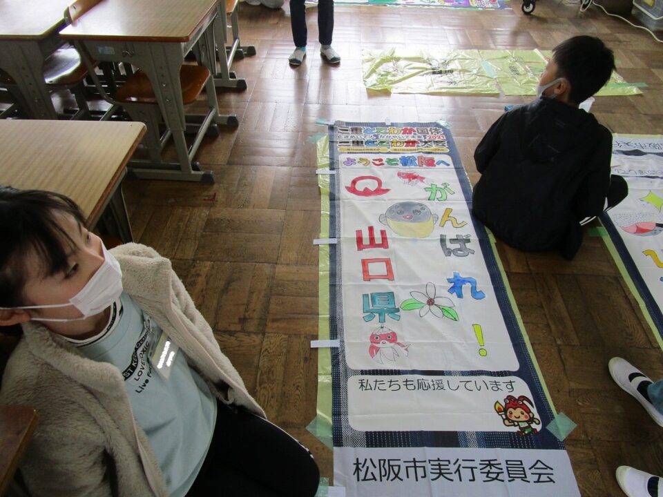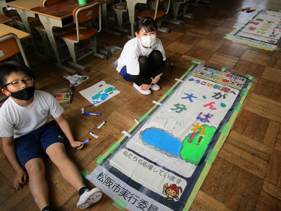 松江小まつえしょうでは、とこわか国体こくたい応援おうえんする『のぼりばた』を作成さくせいしています。