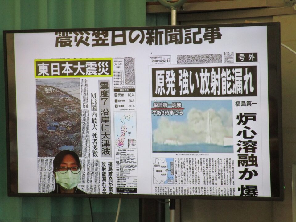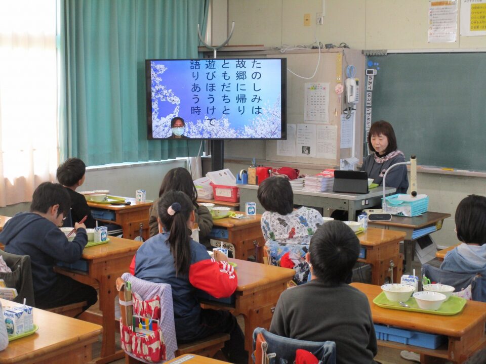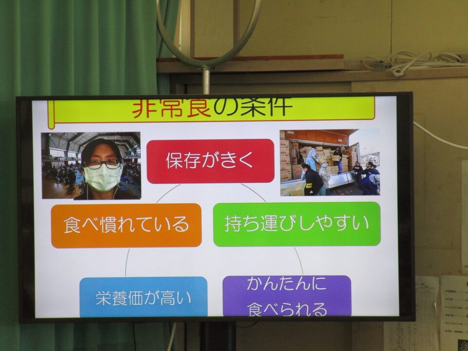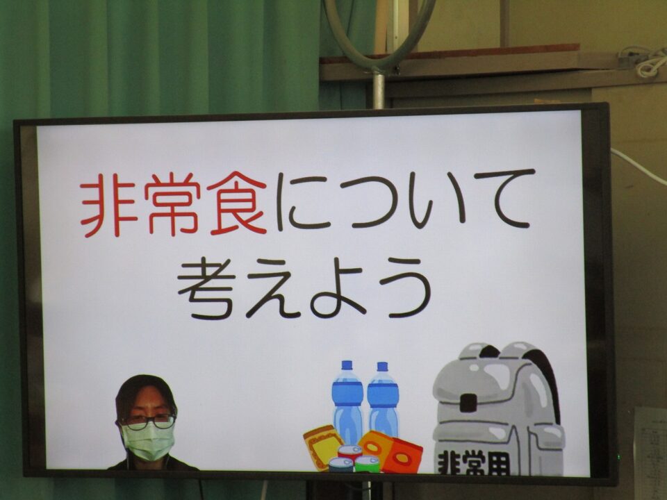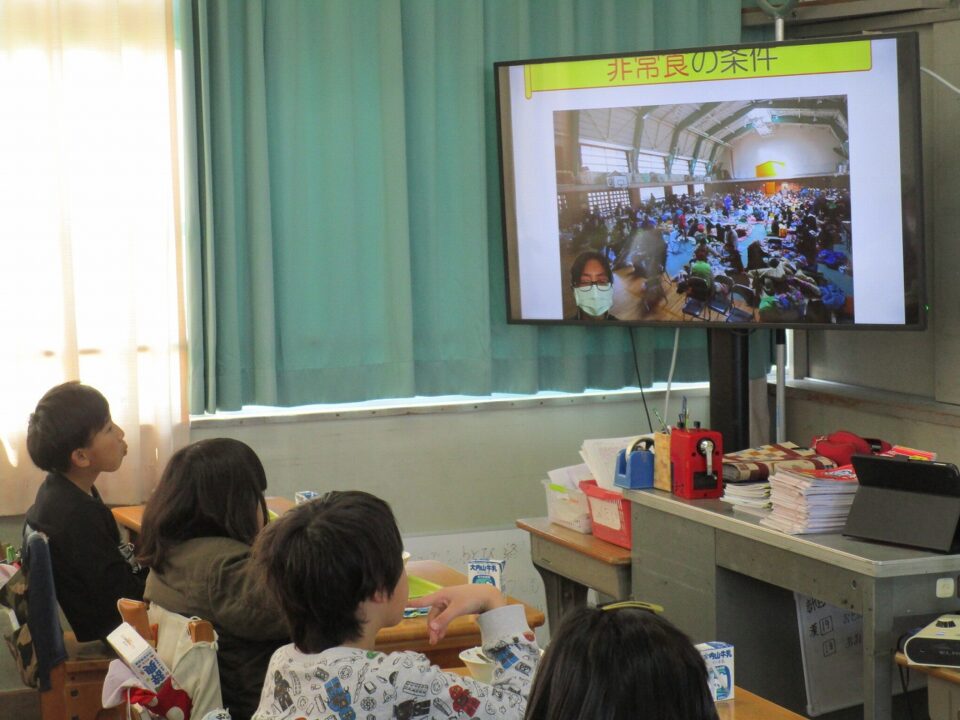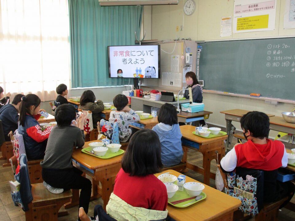 給食きゅうしょく時間じかんにリモートで栄養えいよう出口先生でぐちせんせいから、東日本大震災ひがしにほんだいしんさいかんして、非常食ひじょうしょくなどについてはなしがありました。