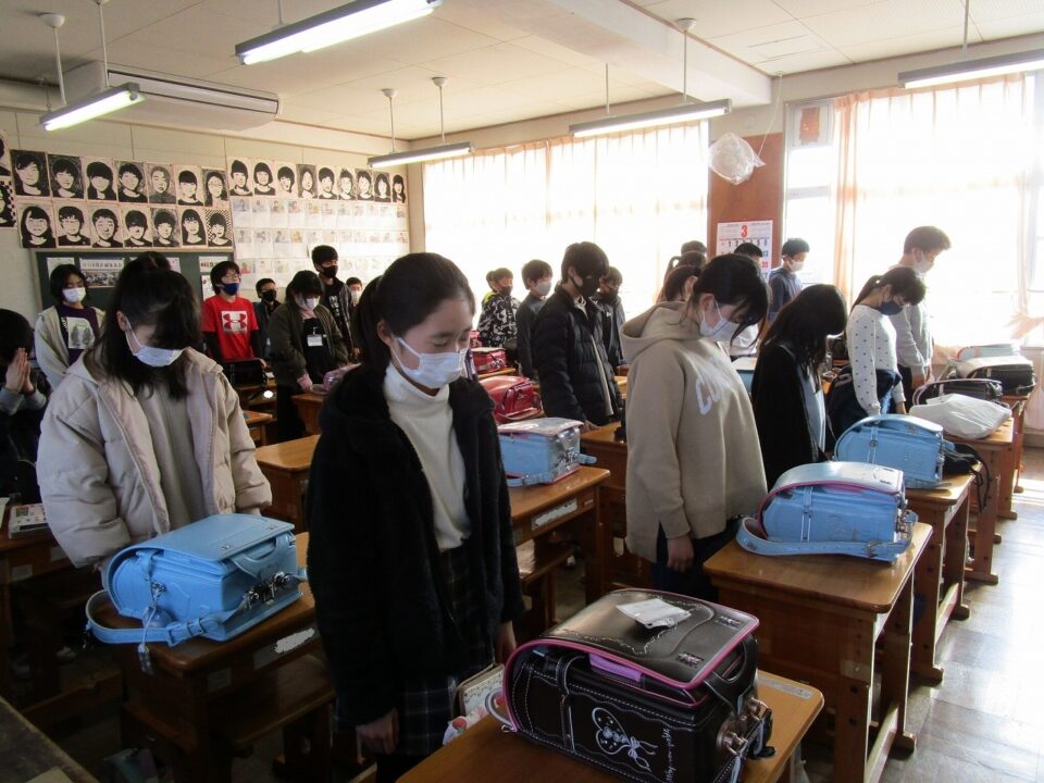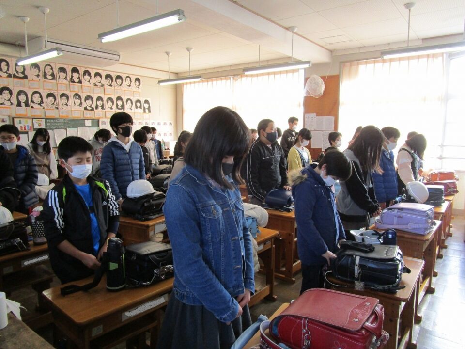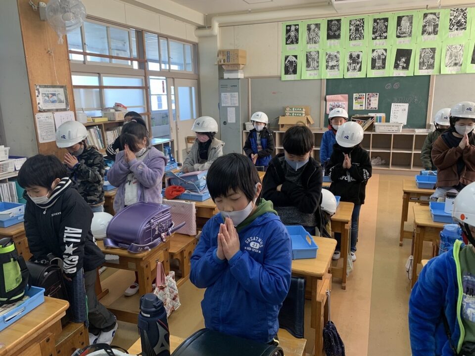 東日本大震災ひがしにほんだいしんさい津波つなみ犠牲ぎせいになられたかたやすらかにねむり、そして、東北地方とうほくちほうのみなさんが元気げんきになられることをおいのりして、全校ぜんこうもくとうをしました。