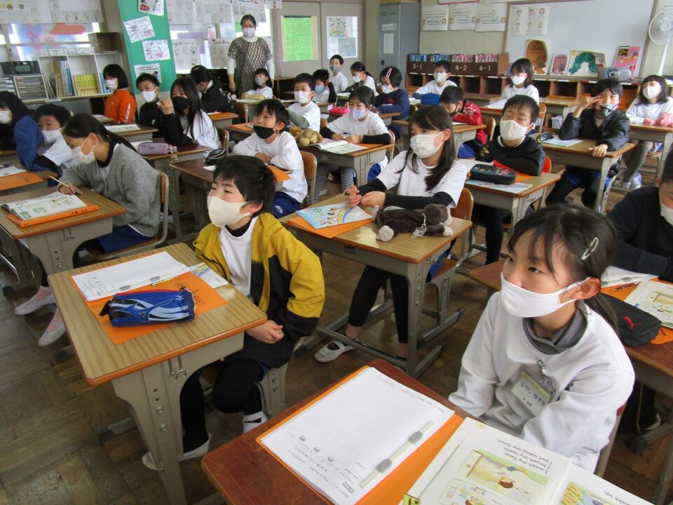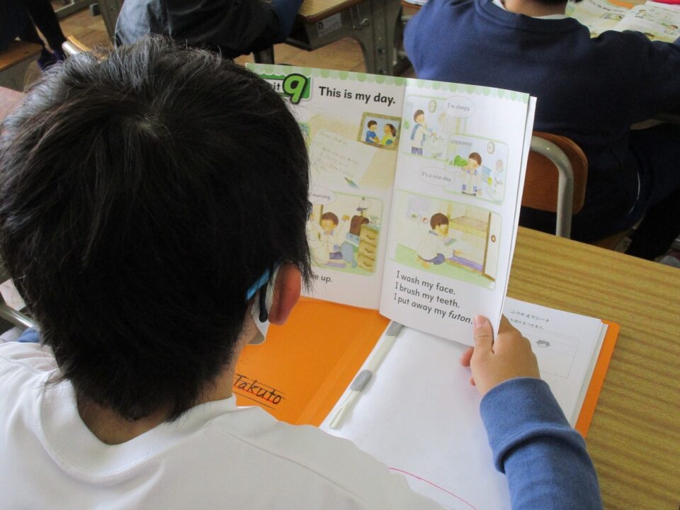 I wake up.から始まり、朝、目覚めた様子のイラストが映し出されていました。4年生は、来年度は『外国語科』という教科の学習になりますね。