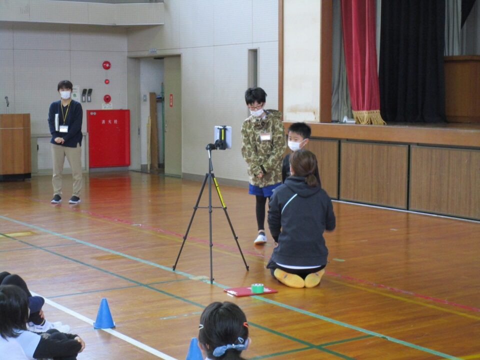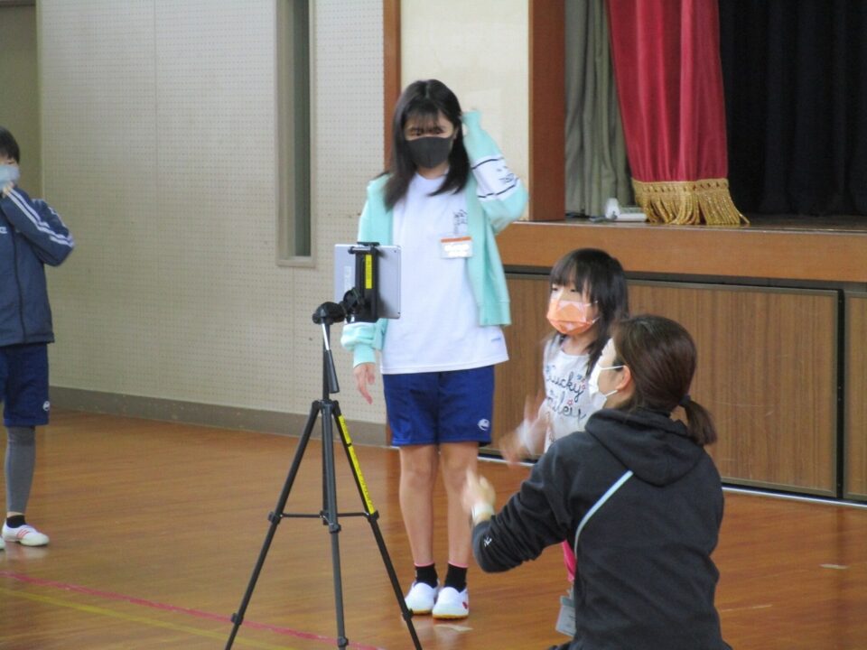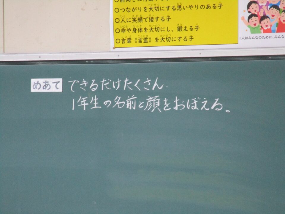 1年生の自己紹介では、6年生の人に立ち方等をサポートしてもらい、カメラに向かい「〇〇〇〇です。よろしくお願いします。」とあいさつができました。
