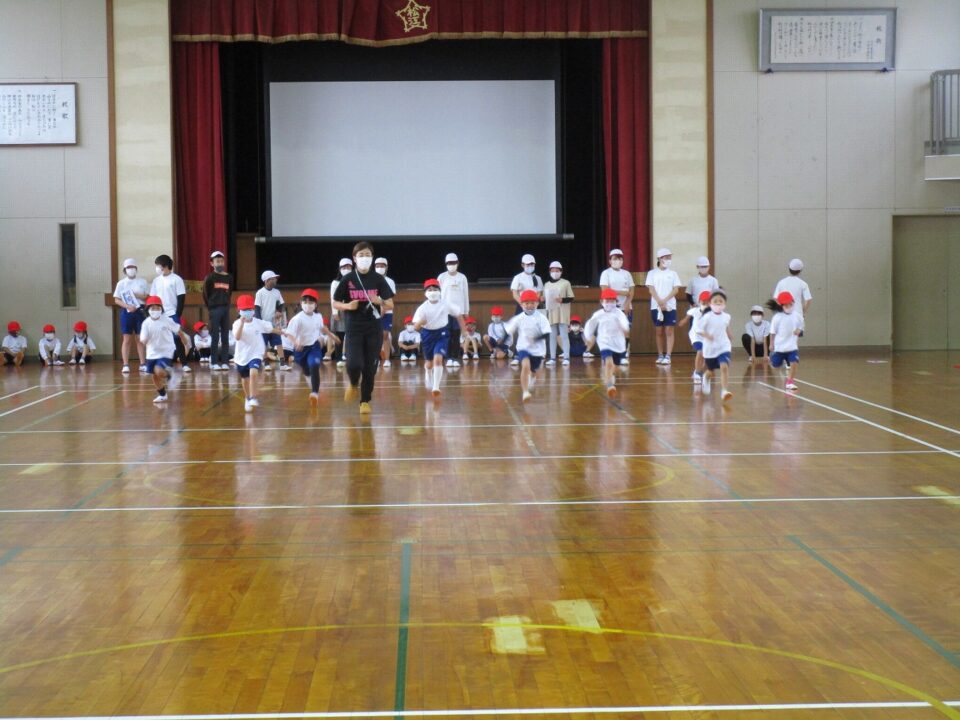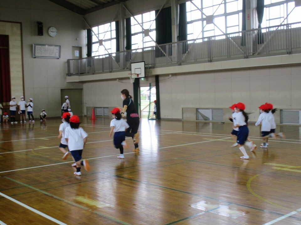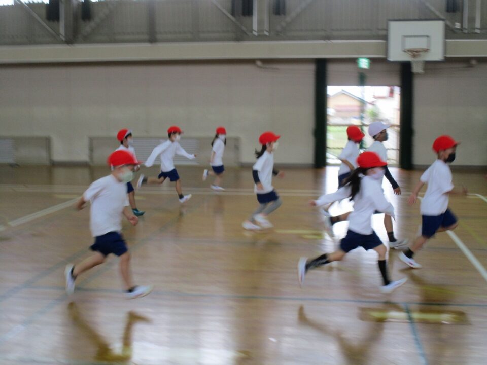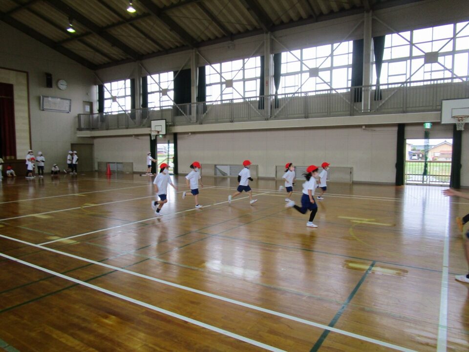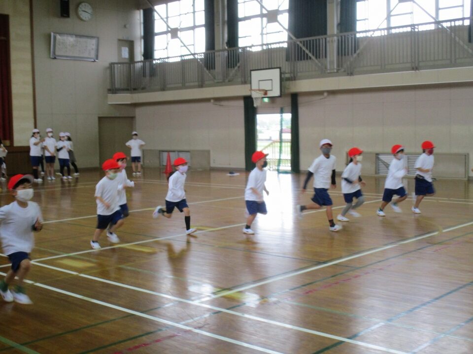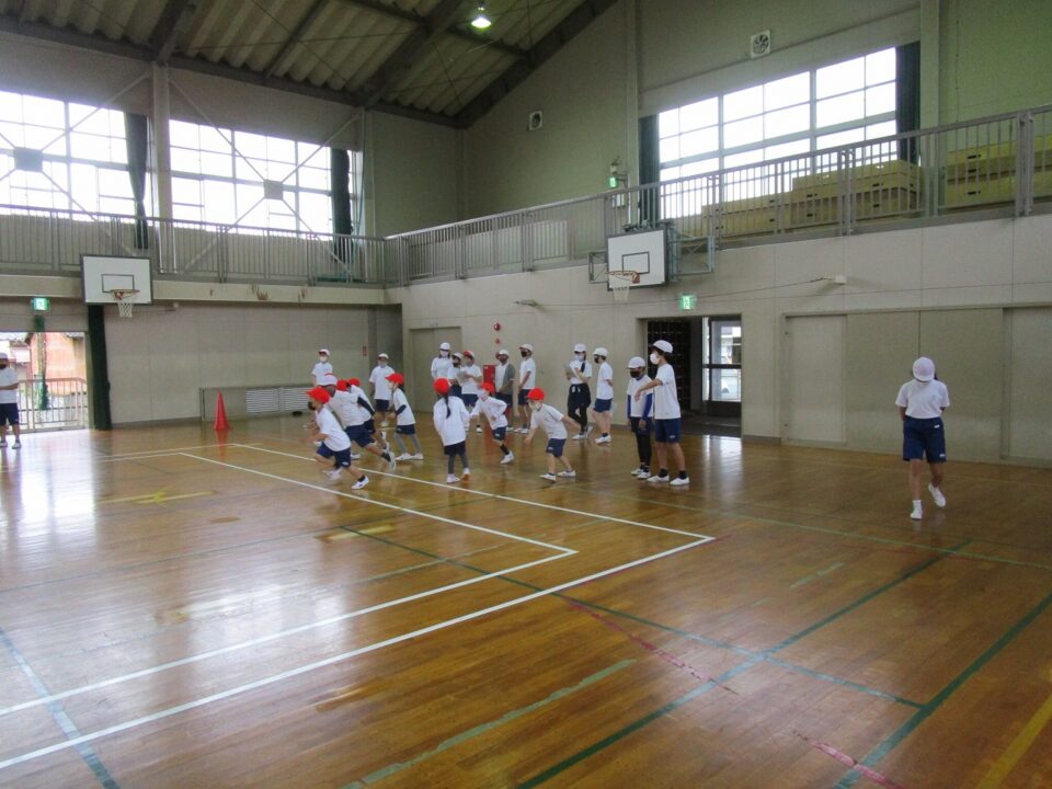 1組は、体育で新体力テストの「シャトルラン」を6年生のお兄さん、お姉さんのお世話のもと、がんばって走りました。