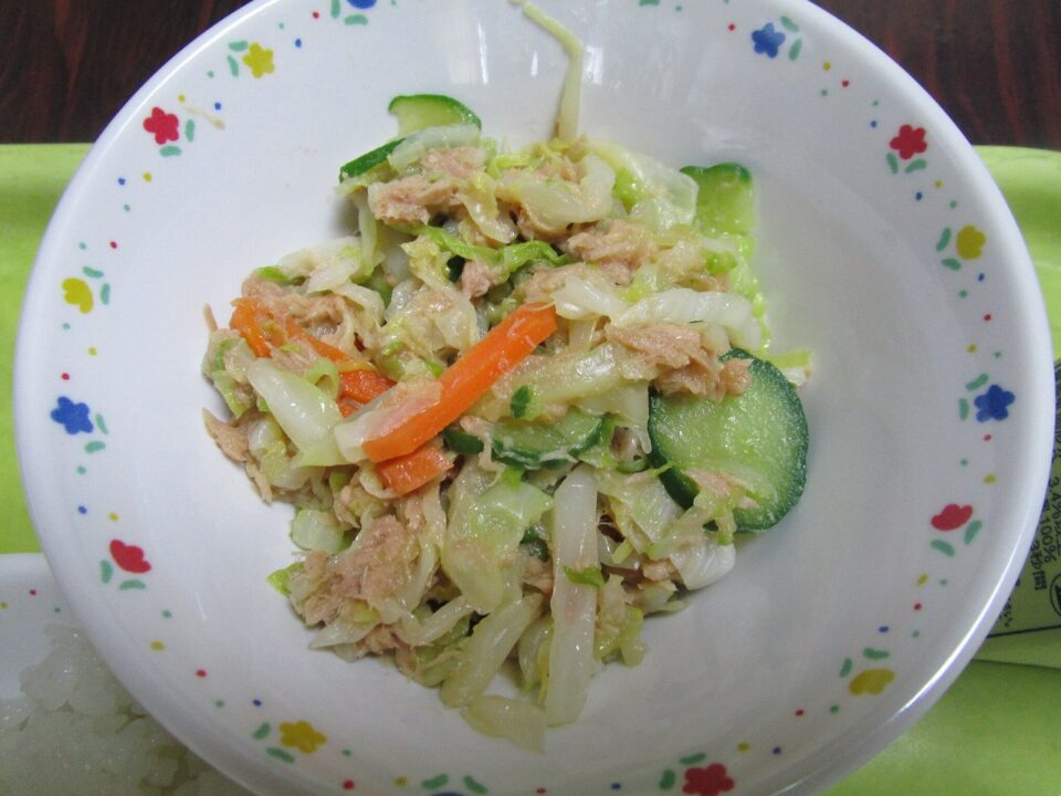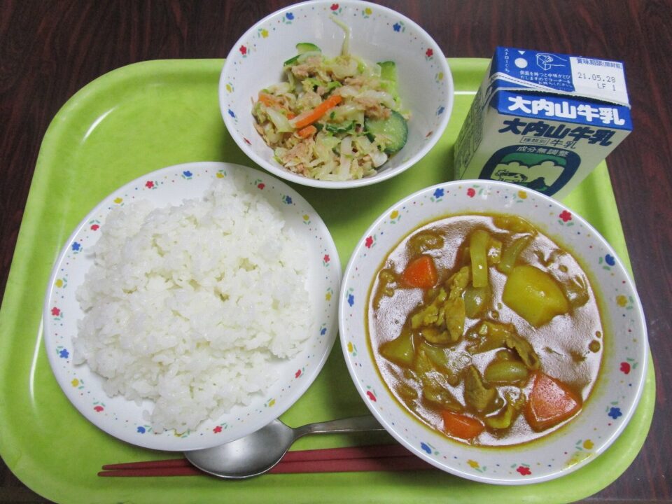 今日の給食は、ポークカレーとツナとキャベツのレモン和えでした。