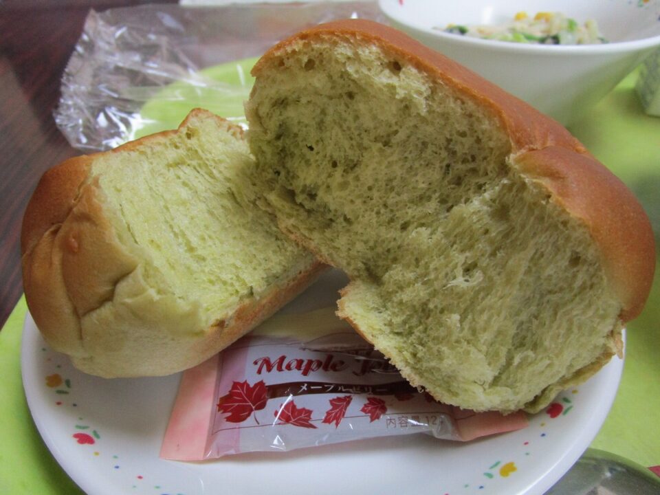 緑茶パンは、松阪市でとれた深蒸し煎茶を粉にして、生地に練り込んで焼いてあります。