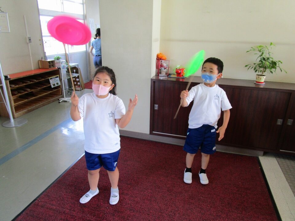 校長室前で皿回しを練習する子も1年生ではいます。もう少しの練習でうまく回せそうですね。私は、2週間練習の末、できるようになりました(≧▽≦)