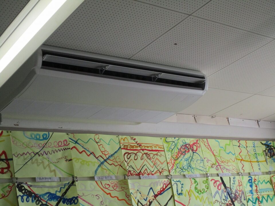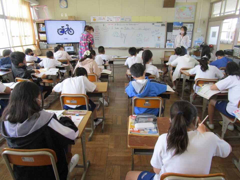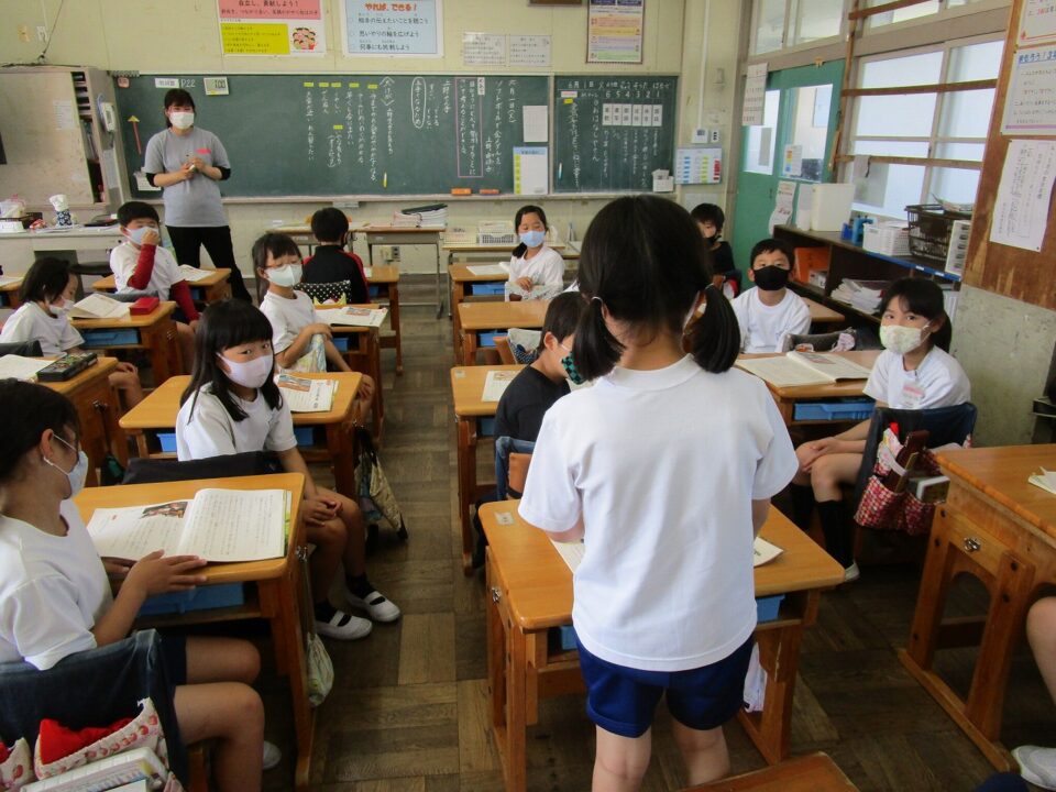 3年生では、エアコンをつけて涼しい中、学習していました。発表する子の方を見てしっかり話を聴いています。
