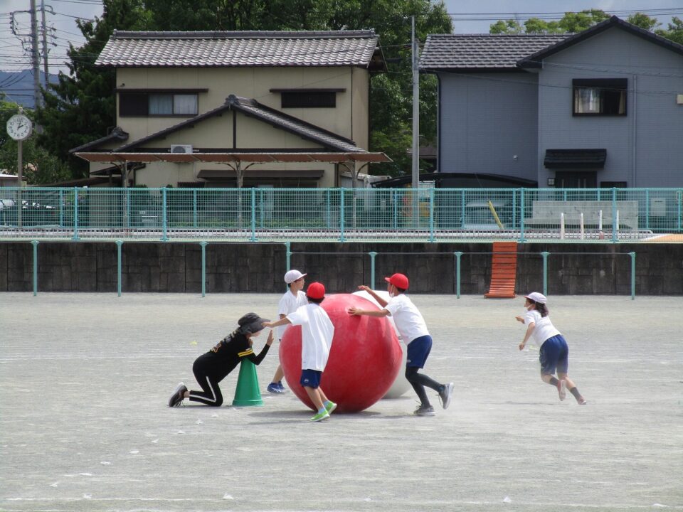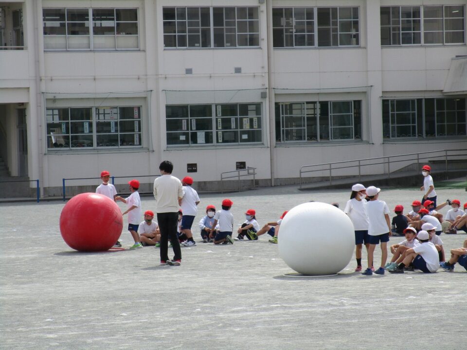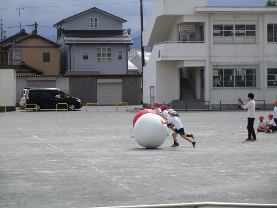 のぞいてみると・・・紅白こうはく大玉おおだま・・・1.2年生ねんせい?  運動会うんどうかい練習れんしゅうは、いったんおやすみのはず・・・?