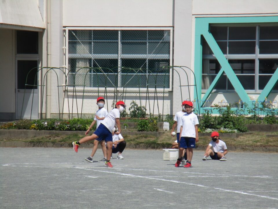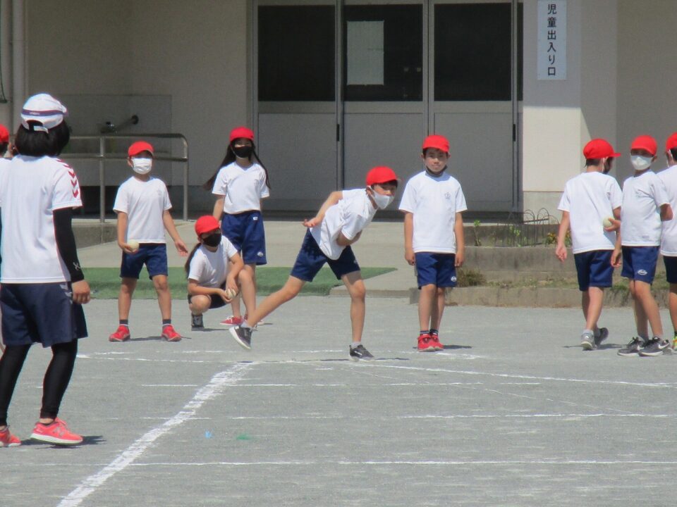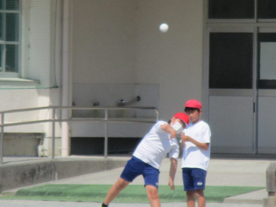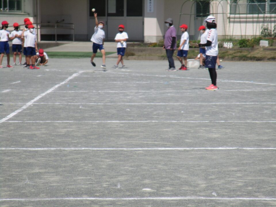 ソフトボール投げを見ていると、みんな投げ方が上手だなあと感心します。しっかり肩の上に腕を振り上げ、片足を前に出し、振りかぶって投げています。すばらしいです。