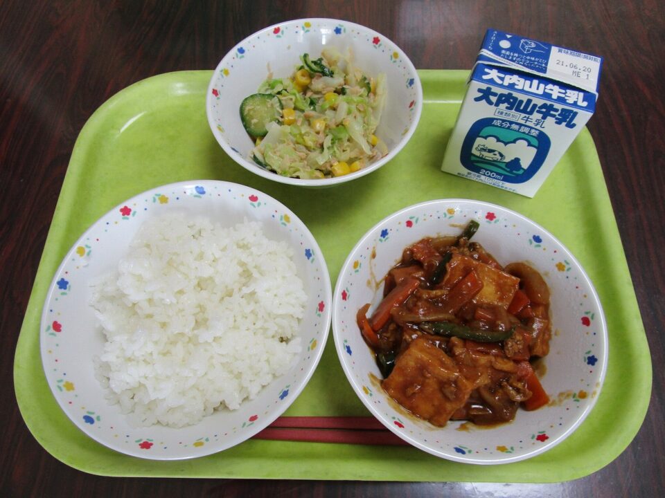 今日の給食は、ご飯、牛乳、厚揚げと豚肉のみそ炒め、ツナと野菜のサラダ でした。