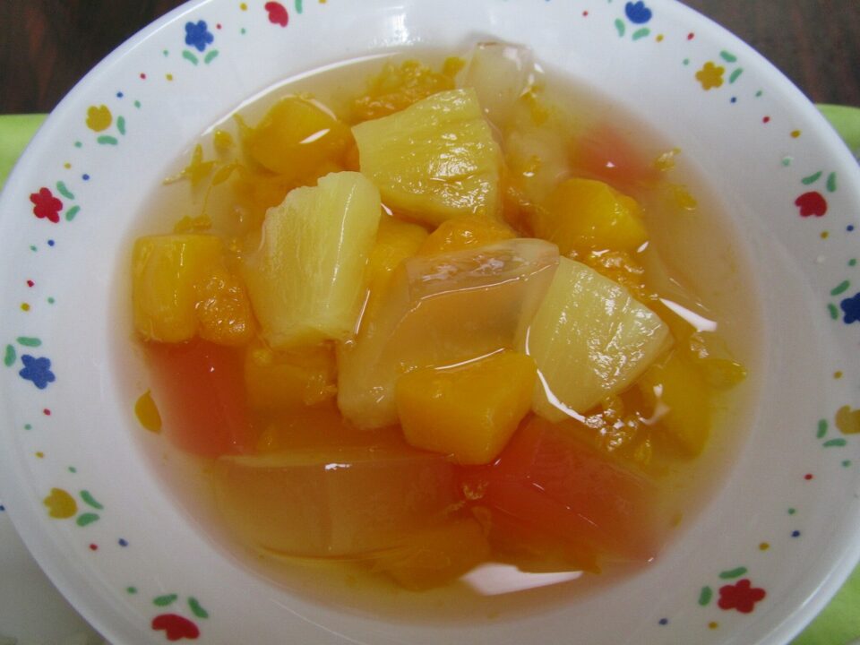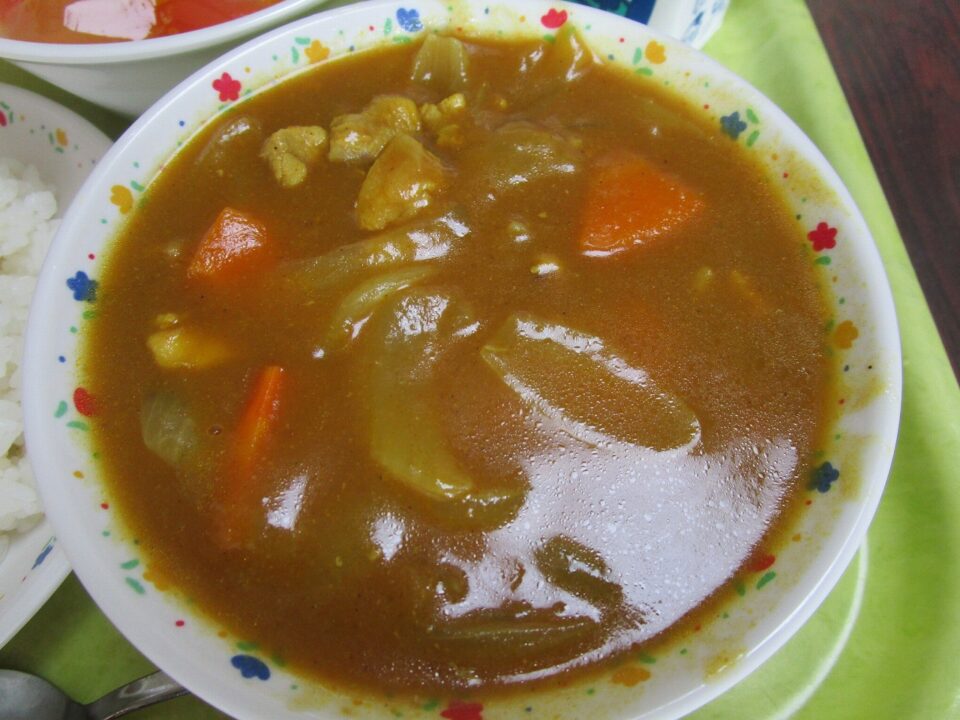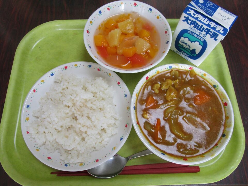 今日の給食は、チキンカレー、ご飯(麦入り)、牛乳、フルーツミックスでした。